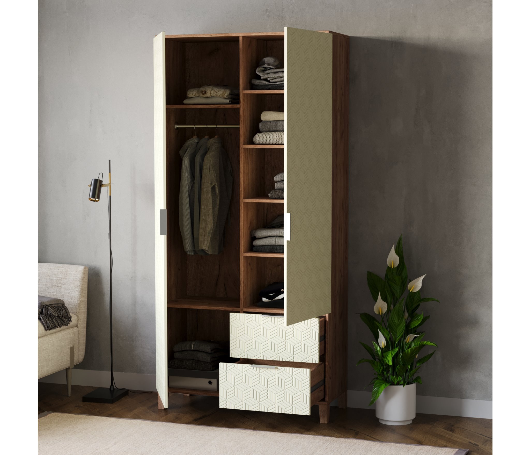 Шкафы Марвин, выполненные в скандинавском стиле, органично дополнят интерьер любой комнаты. Ножки из массива бука, геометрическая фрезеровка на фасадах, сочетание цветов отличительная черта серии Шкафов Марвин.