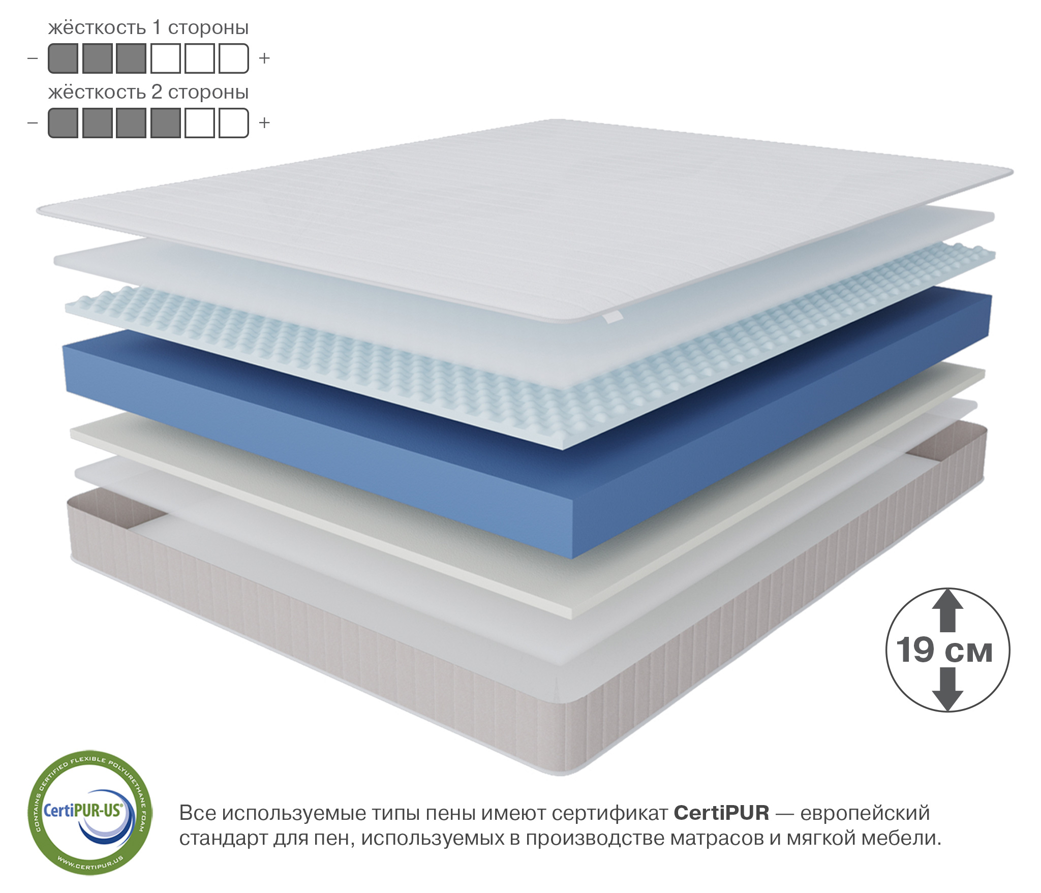 Классический, двусторонний, беспружинный матрас на основе монолитного блока искусственной пены и ячеистого вязкоэластичного поролона. Ячеистый вязкоэластичный поролон (материал с ячейками памяти ) это продукт высоких технологий, самый эластичный и прочный из всех материалов класса «люкс», призванный обеспечить максимальный комфорт и здоровый сон. Данный уникальный материал с вырезанным в виде ячеек верхним рельефным слоем изготовлен на основе вспененного полиуретана поддерживает естественную циркуляцию воздуха внутри матраса, гипоаллергенный, препятствует образованию бактерий, выдерживает большие нагрузки, отлично поддерживает позвоночник, быстро реагирует на тепло, не впитывает влагу, обладает эластичностью, упругостью и микромассажным эффектом. Микромассаж нормализует кровообращение в мышцах, способствуя их расслаблению. Рекомендовано использование вместе с защитным чехлом Aquastop.Подходит для кроватей с подъемным механизмом.