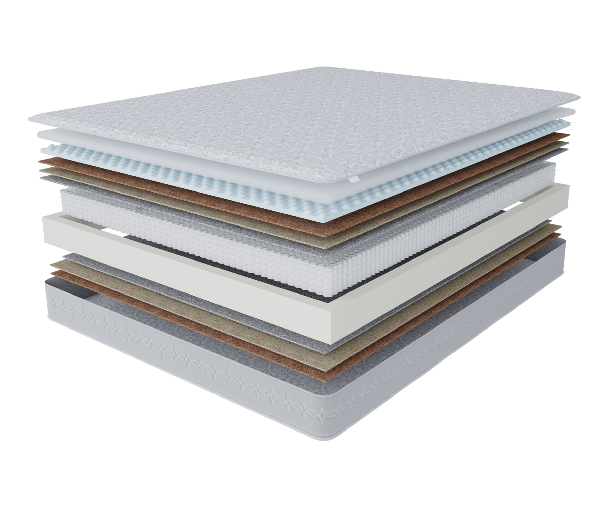 Наполнитель: вязкоэластичный ППУ, сизаль 10 мм, латексированная кокосовая плита 10 мм, термовойлок, латексированная кокосовая плита 20 мм, ячеистая пена с эффектом микромассажа.