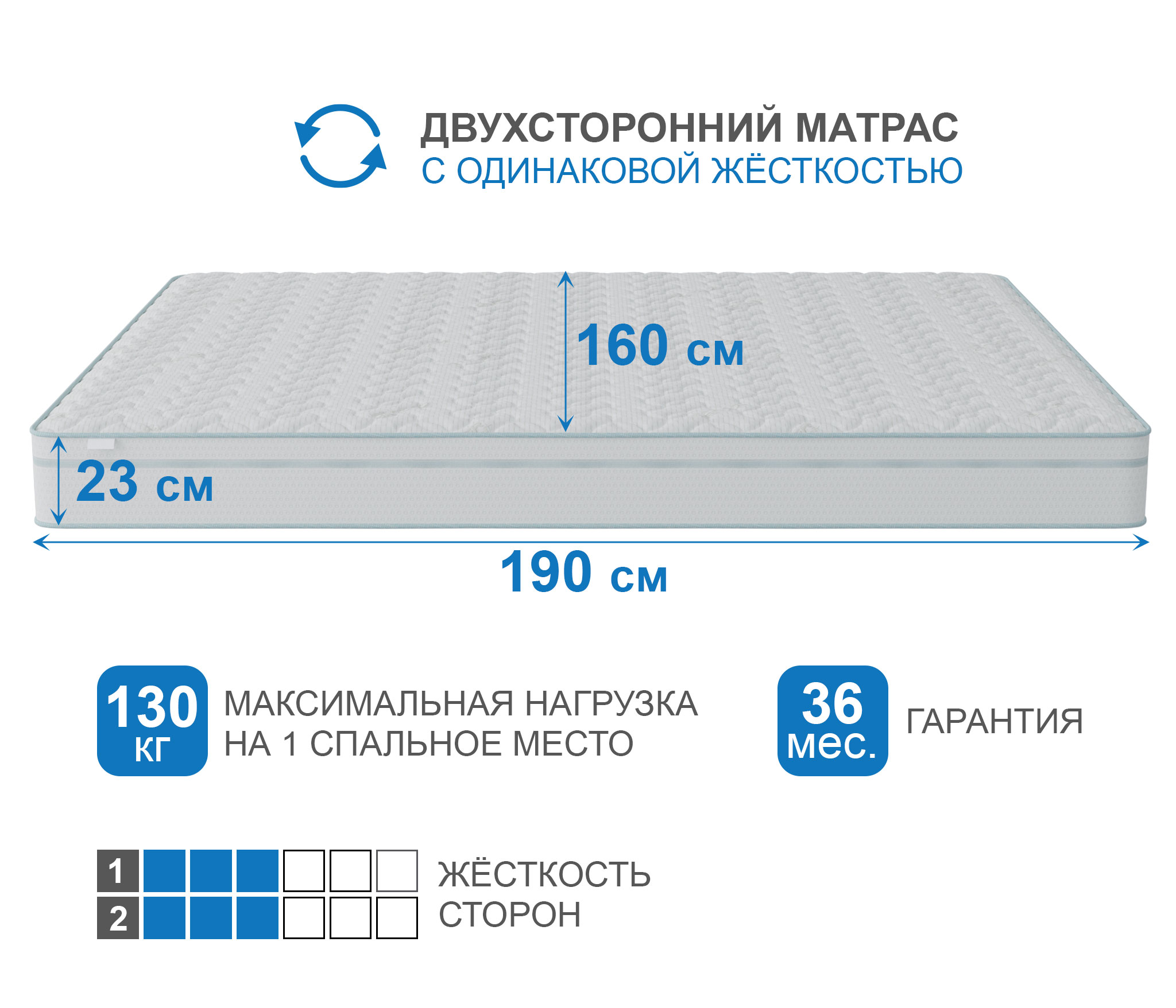 С обеих сторон матраса в качестве комфортного слоя используется 2 см искусственного латекса. Этот материал долговечный и упругий, благодаря этому на матрасе будет одинаково комфортно людям разных весовых категорий.