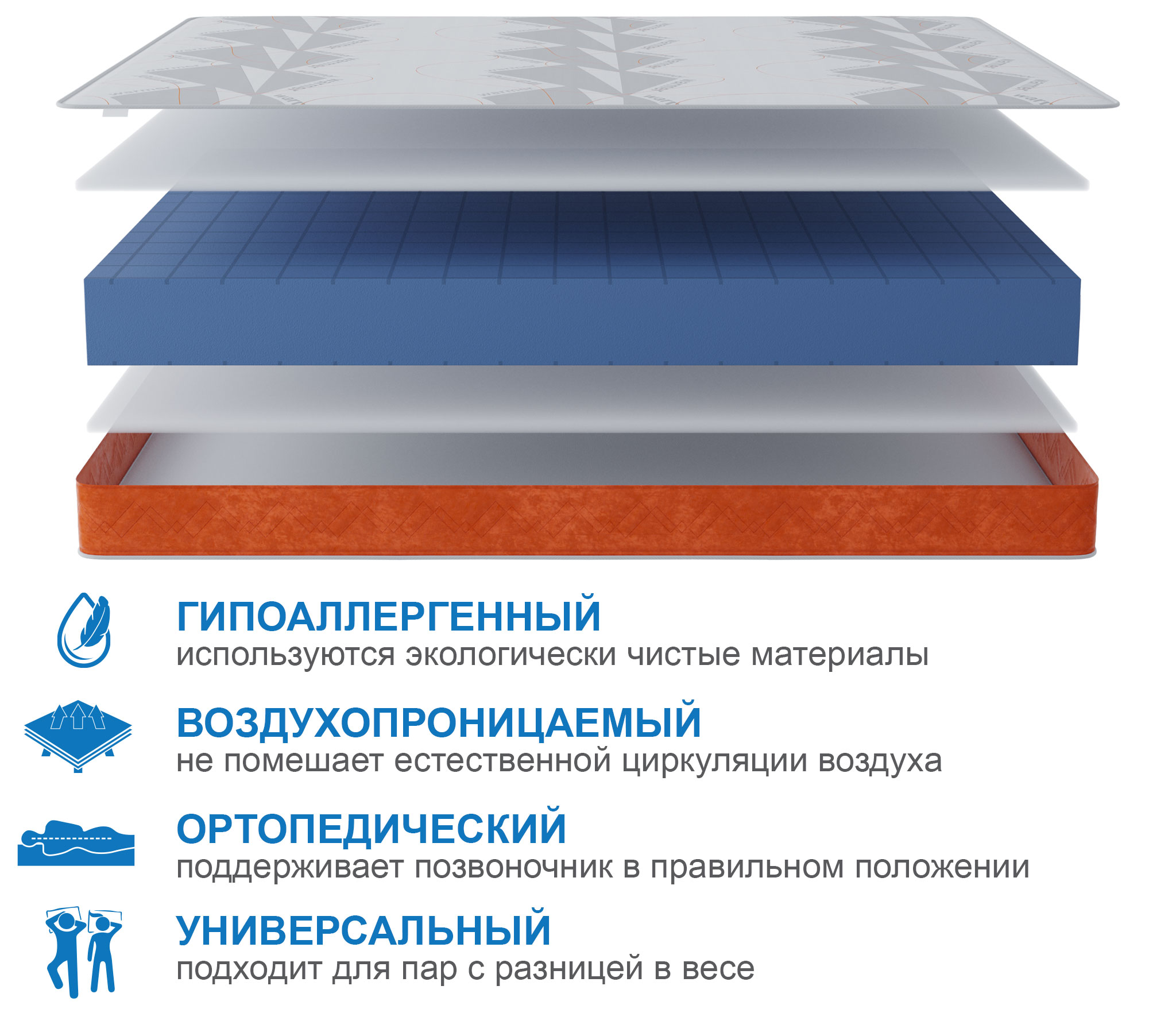 Уникальный бесклеевой и беспружинный матрас, в основе которого лежат передовые технологии умных пен. Данная пена прочная и долговечная, благодаря высокой плотности пены. Чтобы матрас не был чрезмерно жестким, обе стороны матраса перфорированы специальным образом. У нас получилось придать матрасу оптимальную жесткость, не снижая плотности пены.