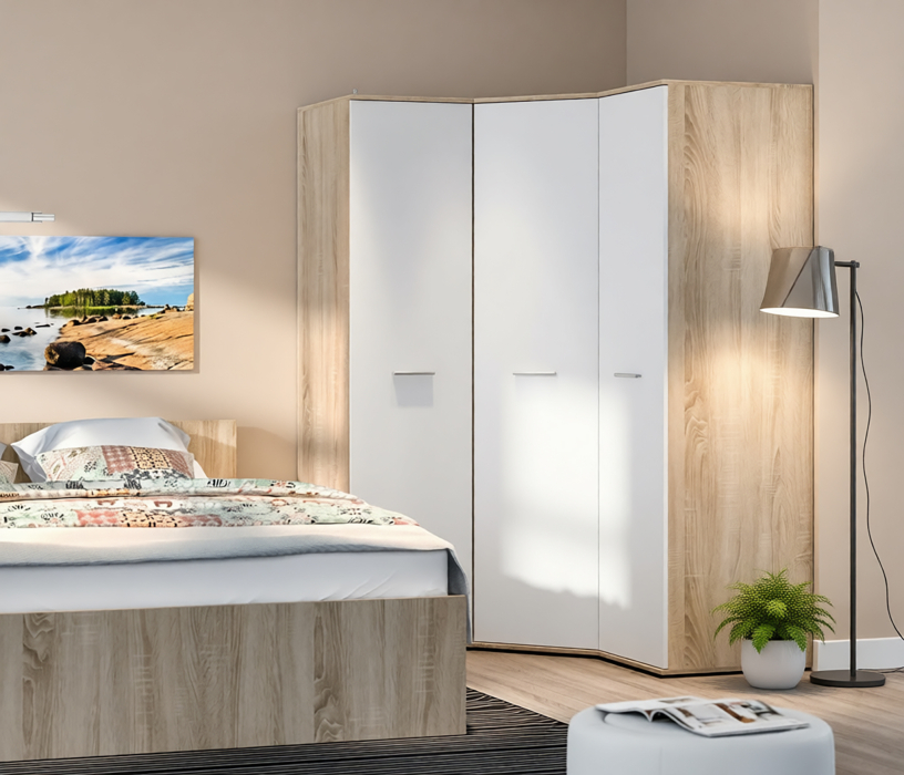 Габариты углового шкафа Мамбо СБ-2678 – ширина 86 см, высота 191 см и глубина 86 см. Это одно вместительное отделение со штангой для верхней одежды с антресолью сверху. Выполнен шкаф из прочного и современного материала КДСП. Цвет отделки корпуса – «Дуб Сонома», а фасадные поверхности белого цвета. Благодаря светлым тонам, шкаф не выглядит громоздким.