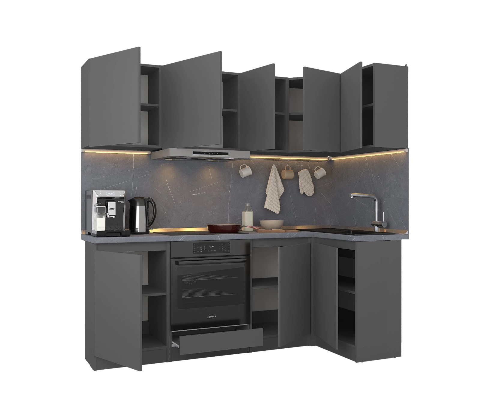 Обратите внимание, что столешница, стеновая панель, мойка и смеситель не входят в комплектацию кухни Леон и приобретаются отдельно. Это позволяет вам выбрать идеальные аксессуары и элементы для создания индивидуального дизайна вашей кухни.