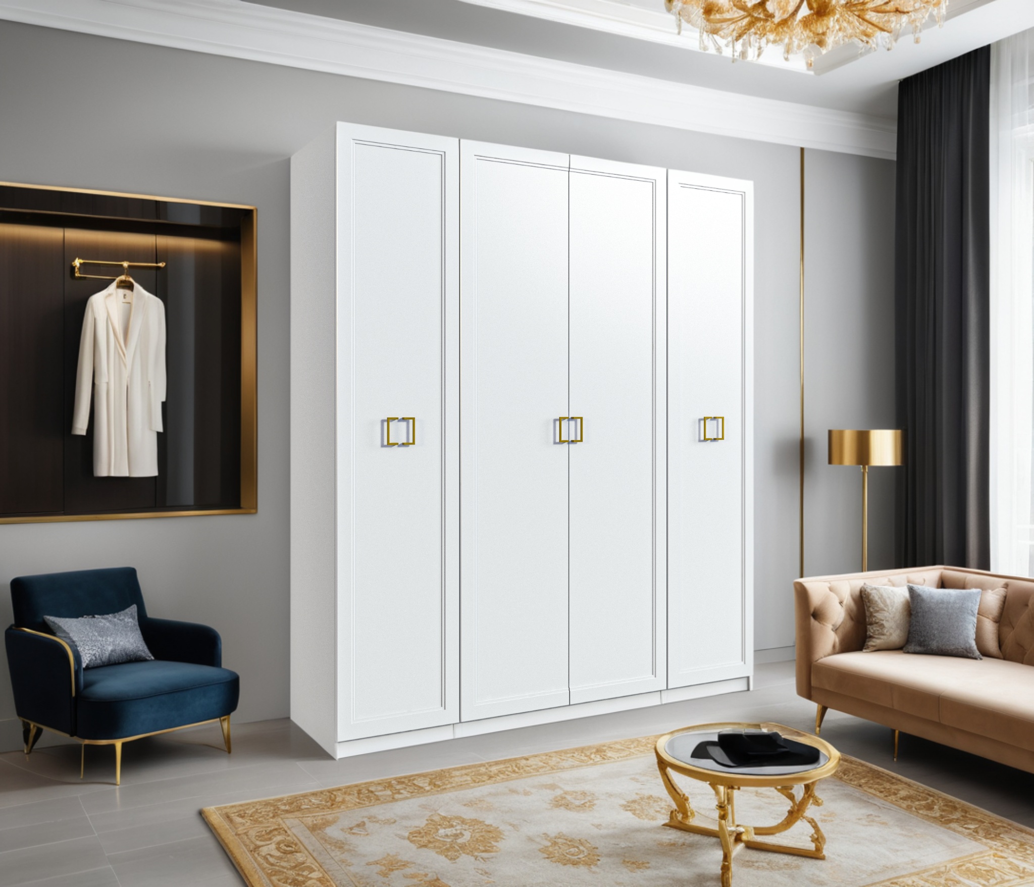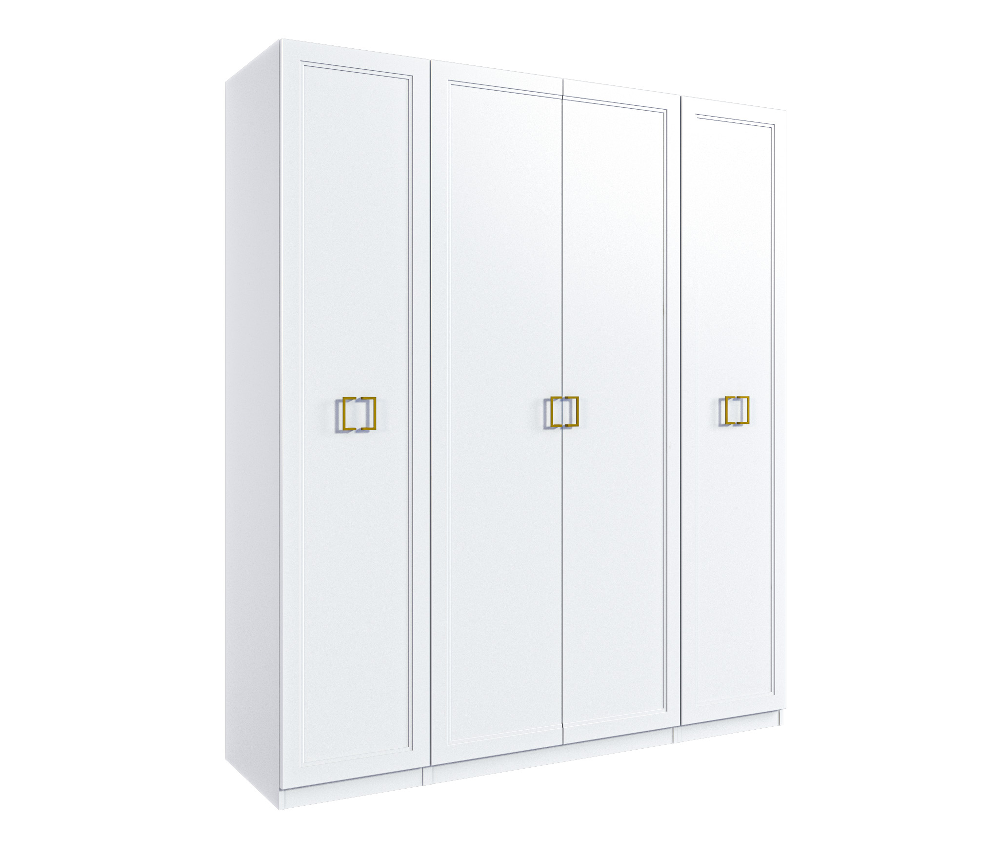 Четырехдверный шкаф Ассоль — стильное и практичное решение для вашего интерьера. Корпус из прочного ЛДСП и фасады из качественного МДФ с элегантными золотыми ручками придают шкафу изысканный вид. Внутреннее наполнение включает полки, ящики и штангу для одежды, обеспечивая удобство и порядок в хранении вещей. Идеально подходит для любой комнаты!