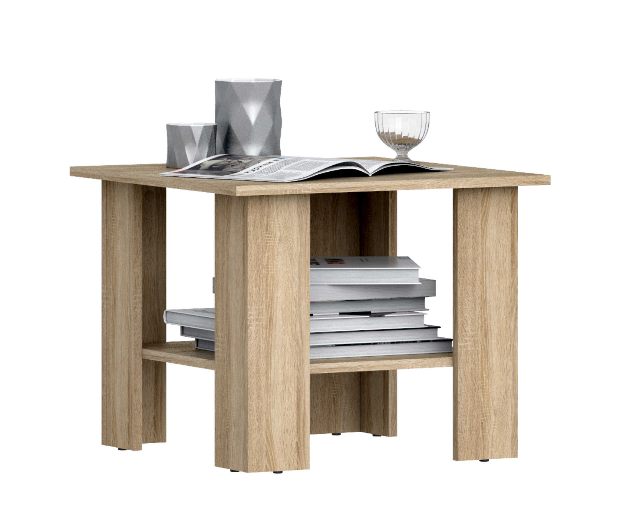 Журнальный стол Кито СБ-2609/1 имеет миниатюрные размеры: ширина 59 см, высота 47 см, глубина 59 см и будет идеальным дополнением интерьера в современном минималистичном стиле. Небольшой вес, чуть более 10 кг, позволяет перемещать стол по усмотрению. Выполнен стол Кито из качественного материала, устойчивого к влаге, что даёт возможность использовать его в качестве обеденного стола. Оформление отделки в цвете «Дуб Сонома». Полка под столешницей позволяет разместить книги или журналы. На ножках стола есть специальные «лапки» или протекторы, которые не позволяют повредить пол.