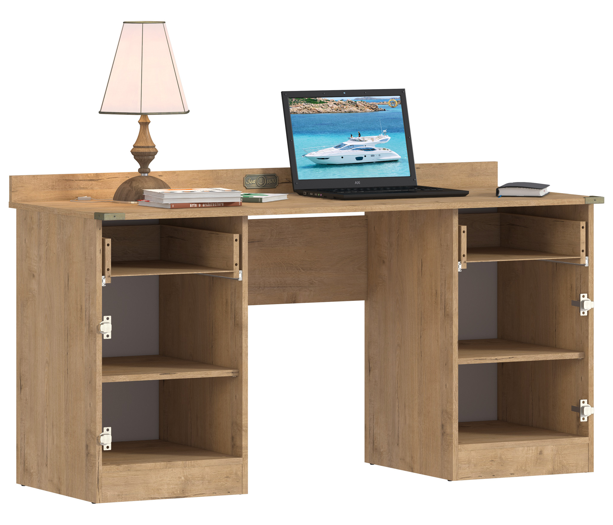 Стол Фрегат СБ-2820 – полноценное и комфортное рабочее место. Стол будет уместен в кабинете или офисе. Органично смотрится как соло самостоятельный предмет мебели, так и в составе модульного гарнитура Фрегат. Габаритные размеры – ширина 150 см, высота 82 см, глубина 59 см. Под столешницей расположены две симметричные закрытые тумбы с полками и два выдвижных вместительных ящика. Производится стол из прочного современного материала КДСП. Отделка в цвете «Дуб Бунратти». Материал отделки не уступает по качеству природному дереву.