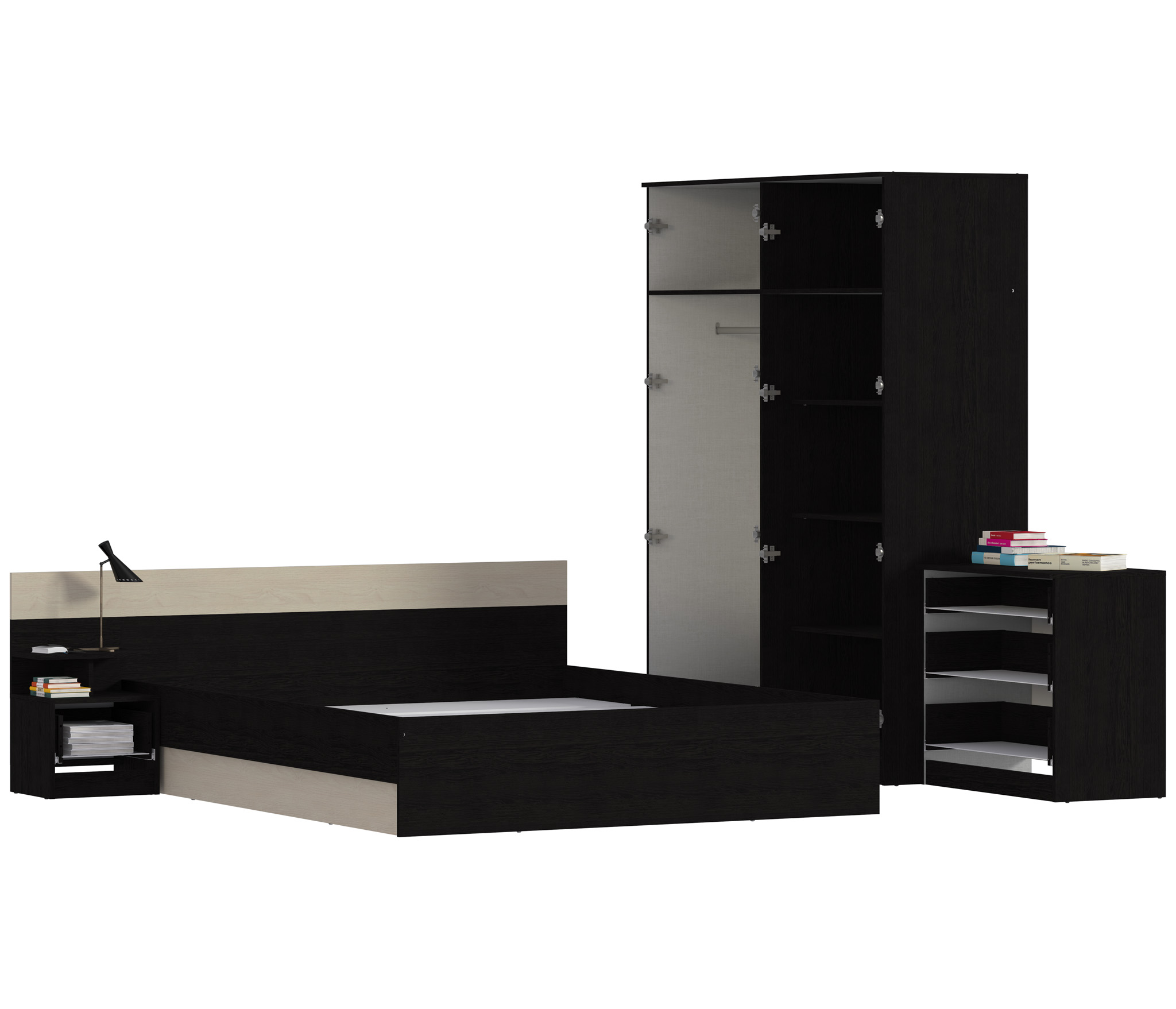 В данный комплект входит: Шкаф 4-х дверный, кровать, комод и одна прикроватная тумба. У кровати стандартное основание из ЛДСП.