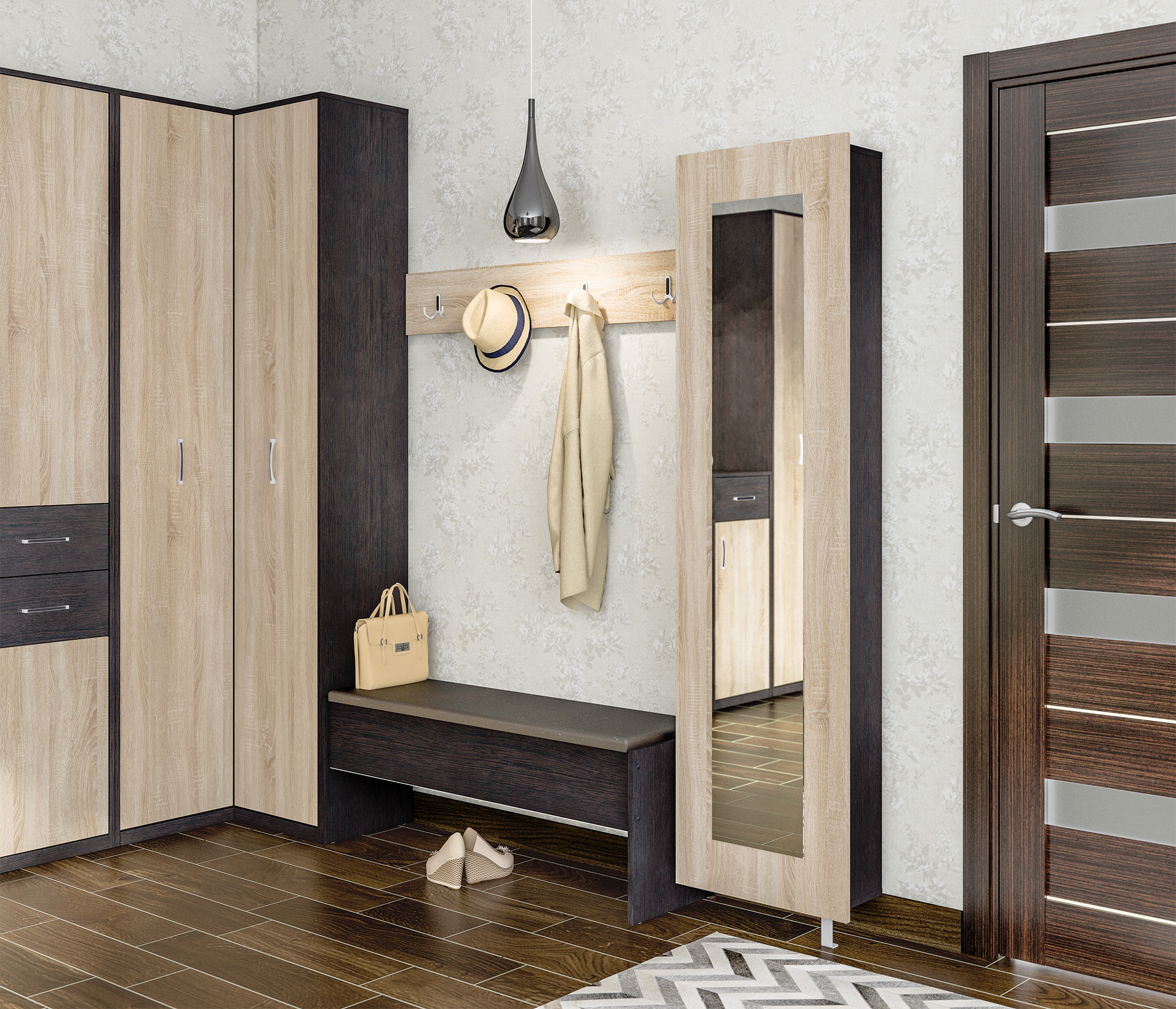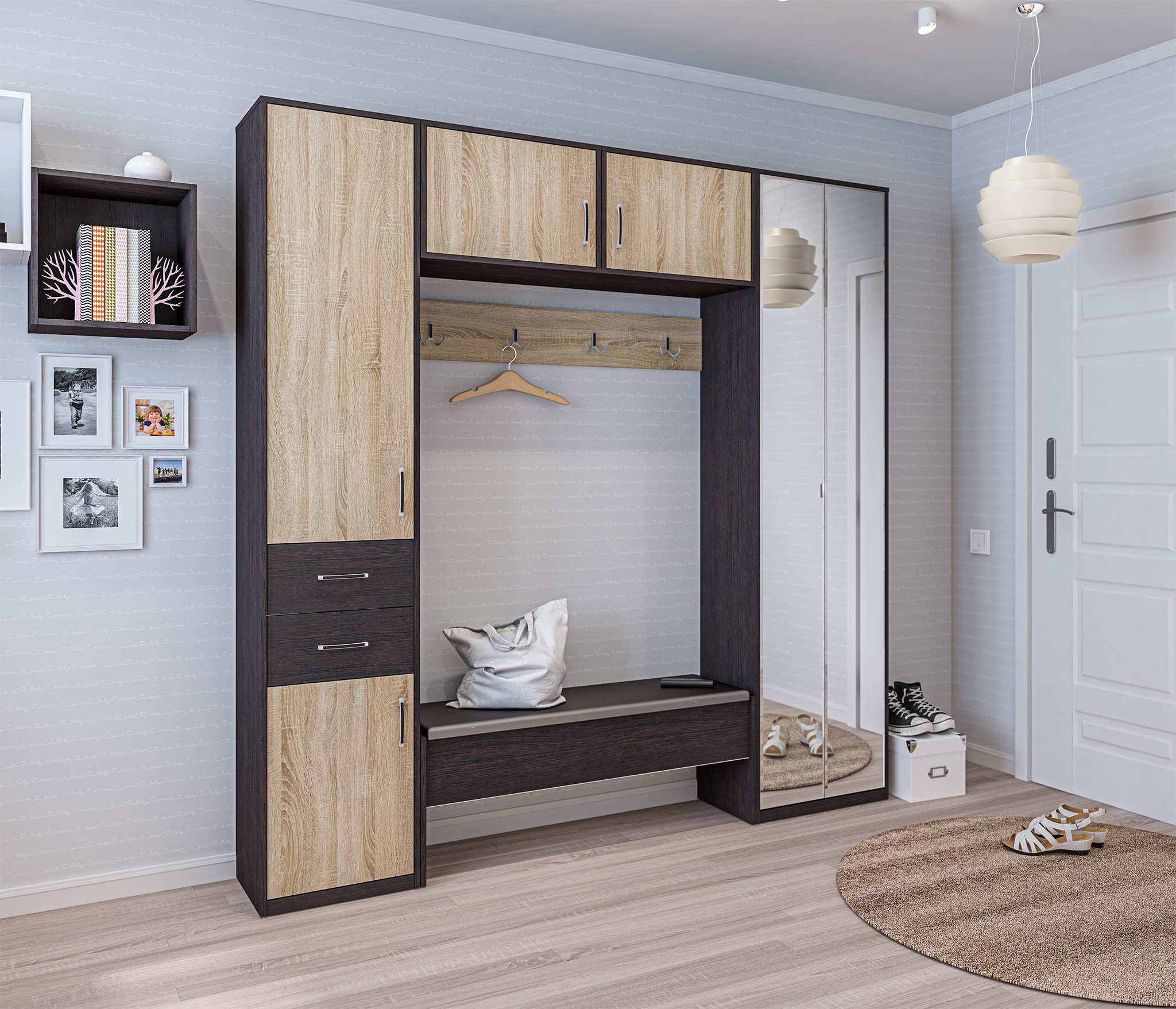 Широкий пуфик — очень полезная штука для прихожей. Можно спокойно сидеть вдвоем. Во внутренних отсеках помещается обувная утварь, под пуфиком достаточно места для средней высоты ботинок или детских сапог.