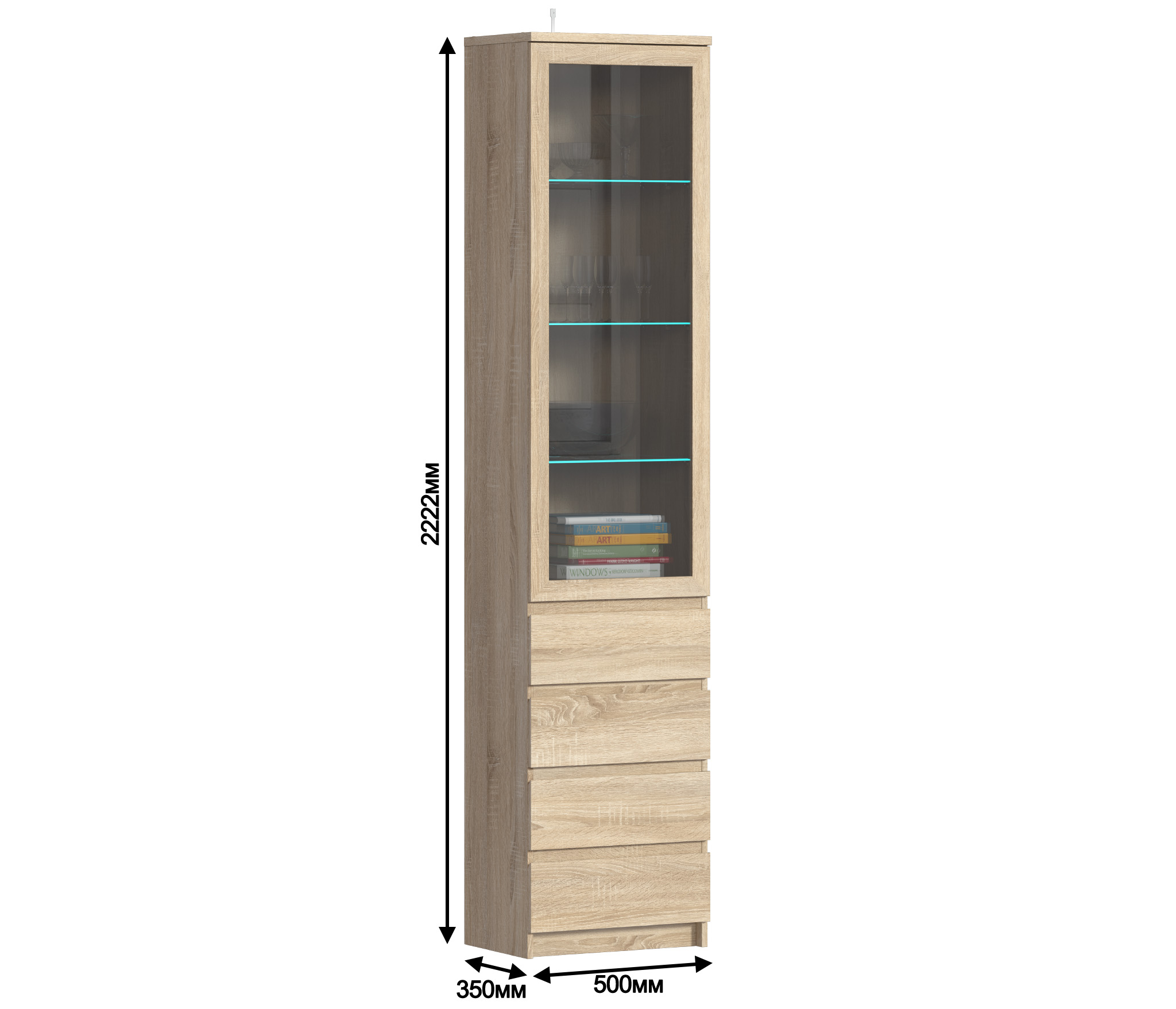При компактных размерах – ширина 50 см, высота 222 см и глубина 35 см, это довольно вместительная витрина, которая позволит решить вопросы, связанные с хранением памятных вещей. Визуально витрина разделена на два отделения – верхнее – выставочное, находится за прозрачной дверцей и имеет четыре полки. Нижнее включает четыре вместительных выдвижных ящика.