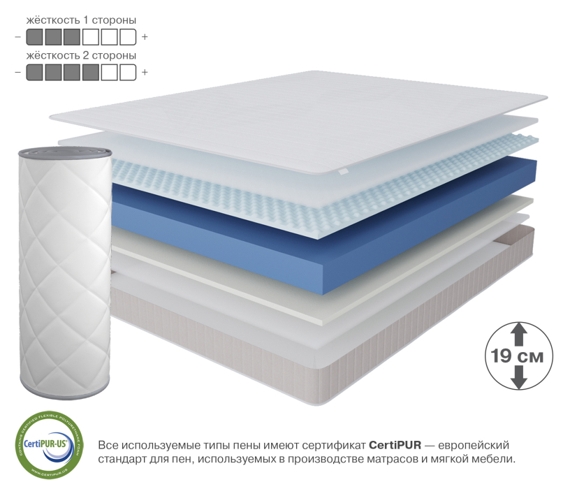 Классический, двусторонний, беспружинный матрас на основе монолитного блока искусственной пены и ячеистого вязкоэластичного поролона. Ячеистый вязкоэластичный поролон (материал с «ячейками памяти») — это продукт высоких технологий, самый эластичный и прочный из всех материалов класса «люкс», призванный обеспечить максимальный комфорт и здоровый сон. Данный уникальный материал с вырезанным в виде ячеек верхним рельефным слоем изготовлен на основе вспененного полиуретана поддерживает естественную циркуляцию воздуха внутри матраса, гипоаллергенный, препятствует образованию бактерий, выдерживает большие нагрузки, отлично поддерживает позвоночник, быстро реагирует на тепло, не впитывает влагу, обладает эластичностью, упругостью и микромассажным эффектом. Микромассаж нормализует кровообращение в мышцах, способствуя их расслаблению. Рекомендовано использование вместе с защитным чехлом Aquastop.Подходит для кроватей с подъемным механизмом.