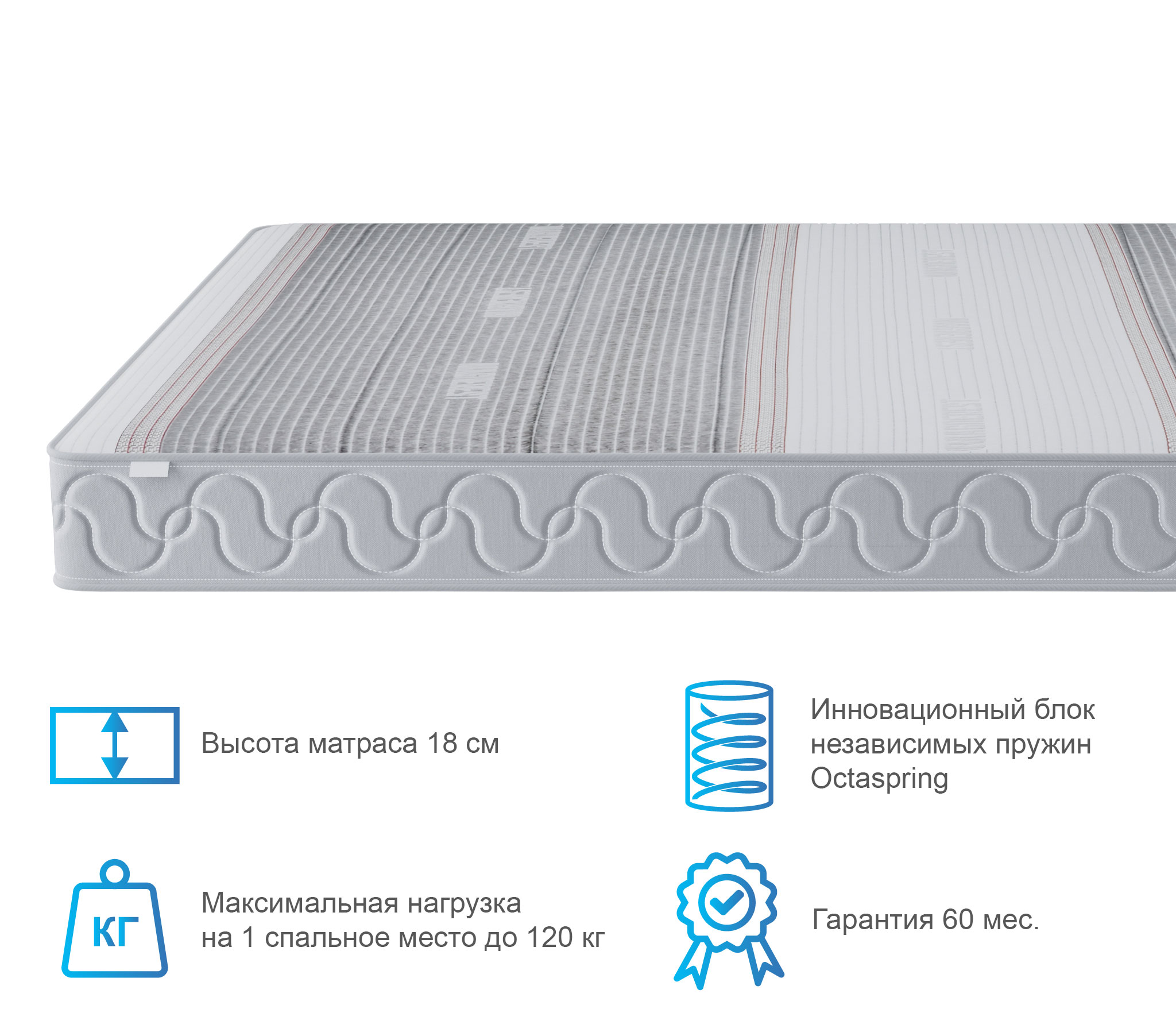 Матрас имеет 3 зоны жесткости для индивидуальной поддержки каждой части тела. Жесткость каждой зоны подобрана таким образом, чтобы обеспечить надежную опору позвоночнику, сохраняя его в правильном положении. Такие свойства матраса с использованием индивидуального зонирования максимально усиливают поддерживающий эффект более тяжелых частей тела и позволяют матрасу хорошо подстраиваться под контуры человеческого тела. Пружины Octaspring из пены высокой плотности имеют структуру медовых сот, благодаря которой вентиляция матраса Спектр в 8 раз выше вентиляции других пенных матрасов. Повышенная воздухопроницаемость пружин Octaspring обеспечивает комфортную свежесть спального места на протяжении всей ночи.