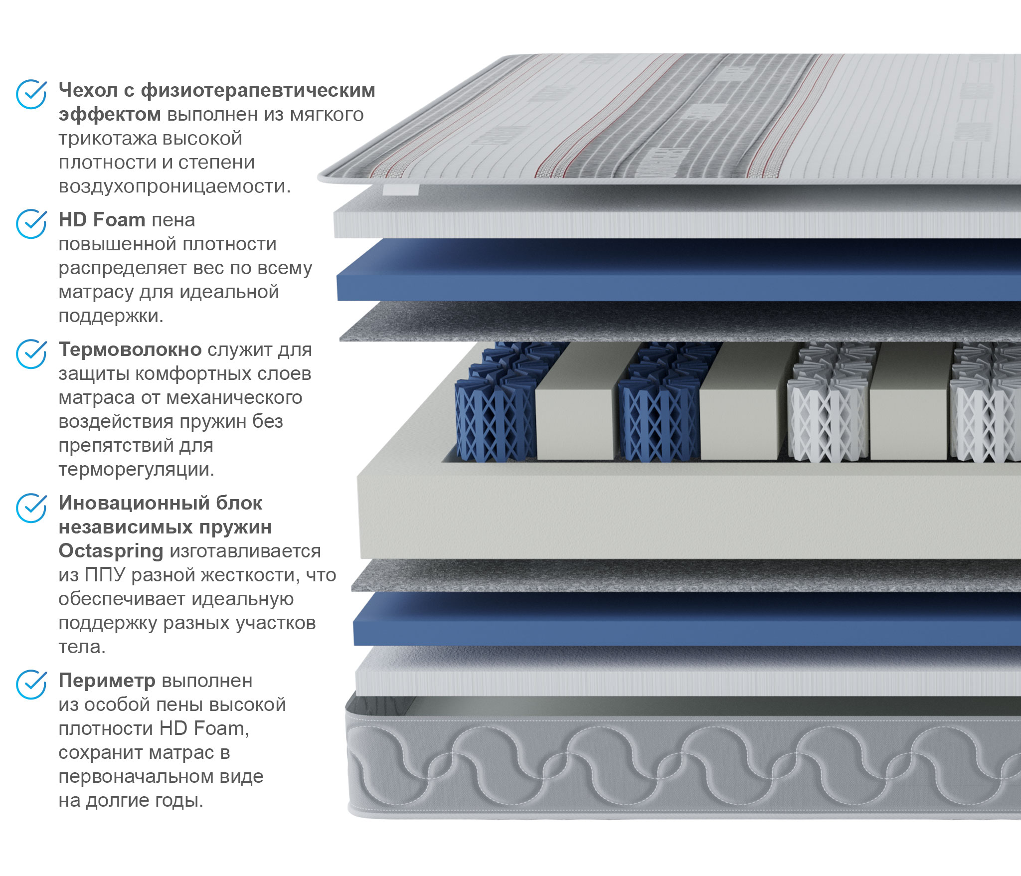 Пена Sky Cell дарит упругую поддержку и комфортную высокую жесткость. Она прекрасно распределяет нагрузку и обеспечивает качественную опору каждой части тела человека. Ребра жесткости из высокоплотной пены по всей площади матраса обеспечивают уникальную упругость, дарящую здоровый сон и заряд бодрости на весь день. Повышенная воздухопроницаемость пружин Octaspring обеспечивает комфортную свежесть спального места на протяжении всей ночи.