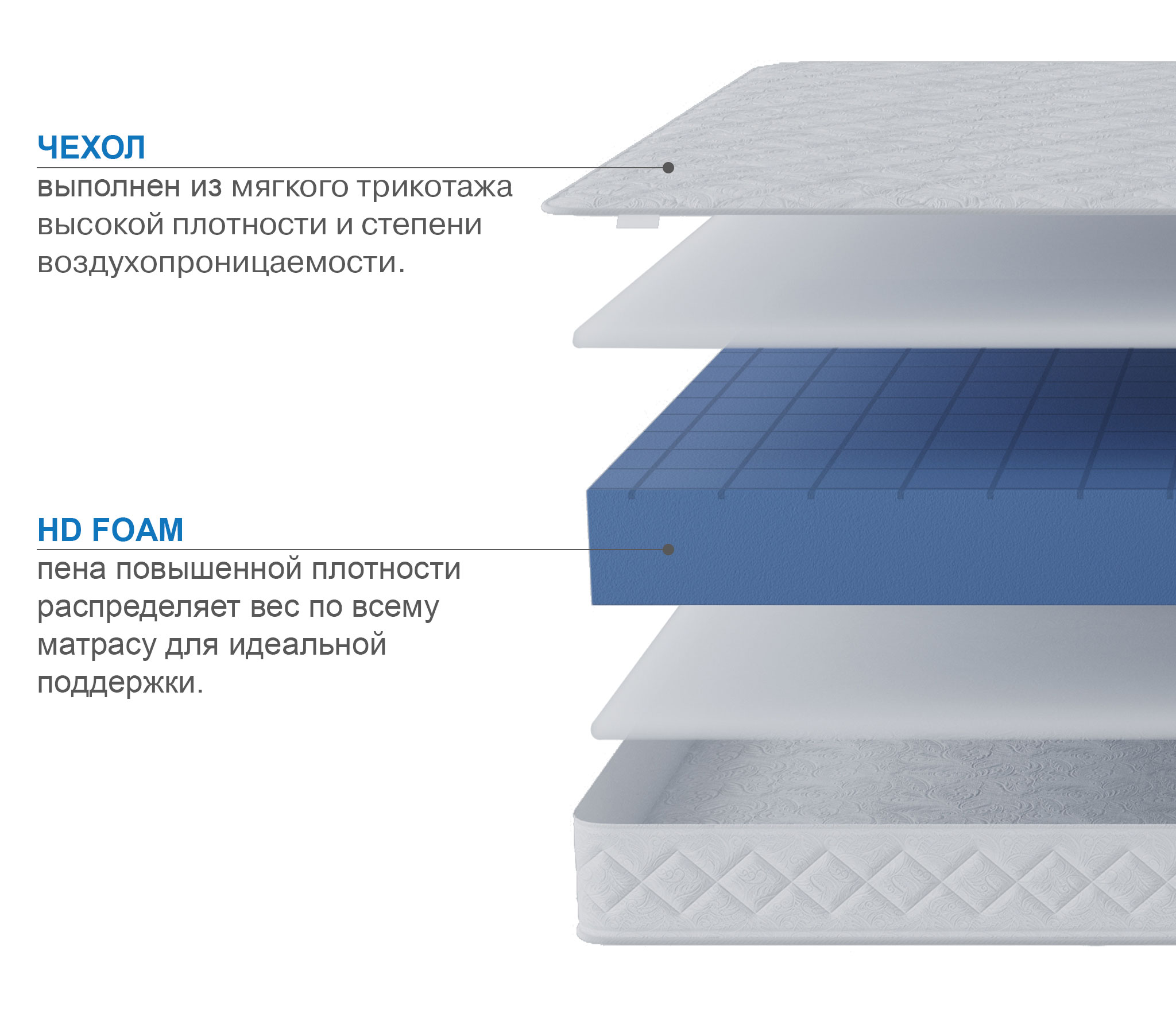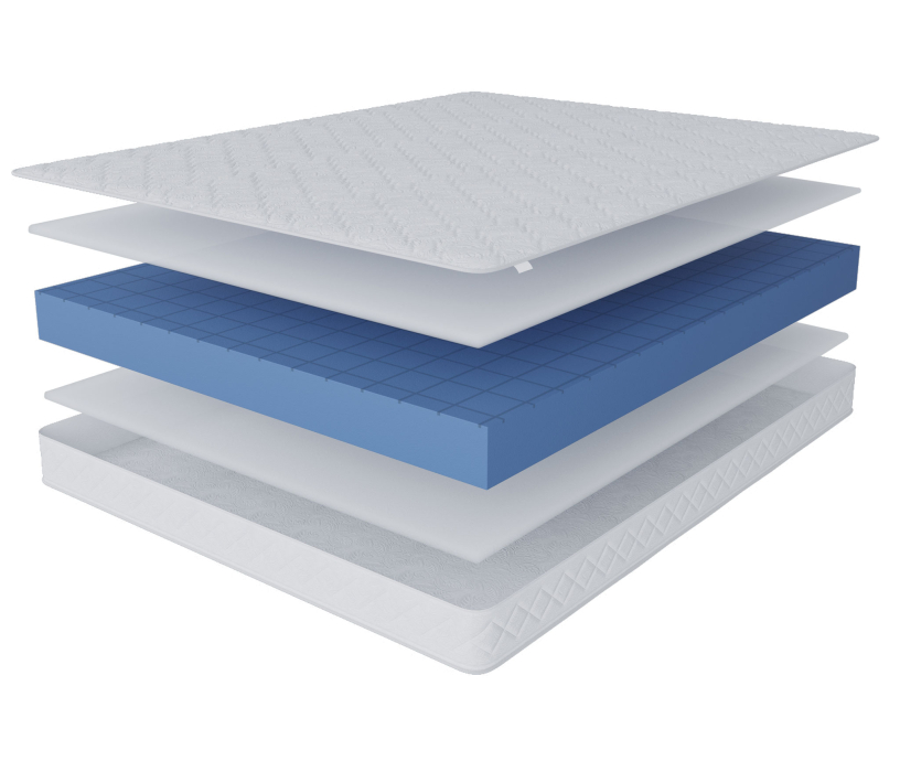 Первый слой – гипоаллергенная пена с прорезями ST Foam, которая снимает напряжение со спины во время сна. Основу матраса составляет пена повышенной прочности HD Foam, принимает на себя основную нагрузку.
