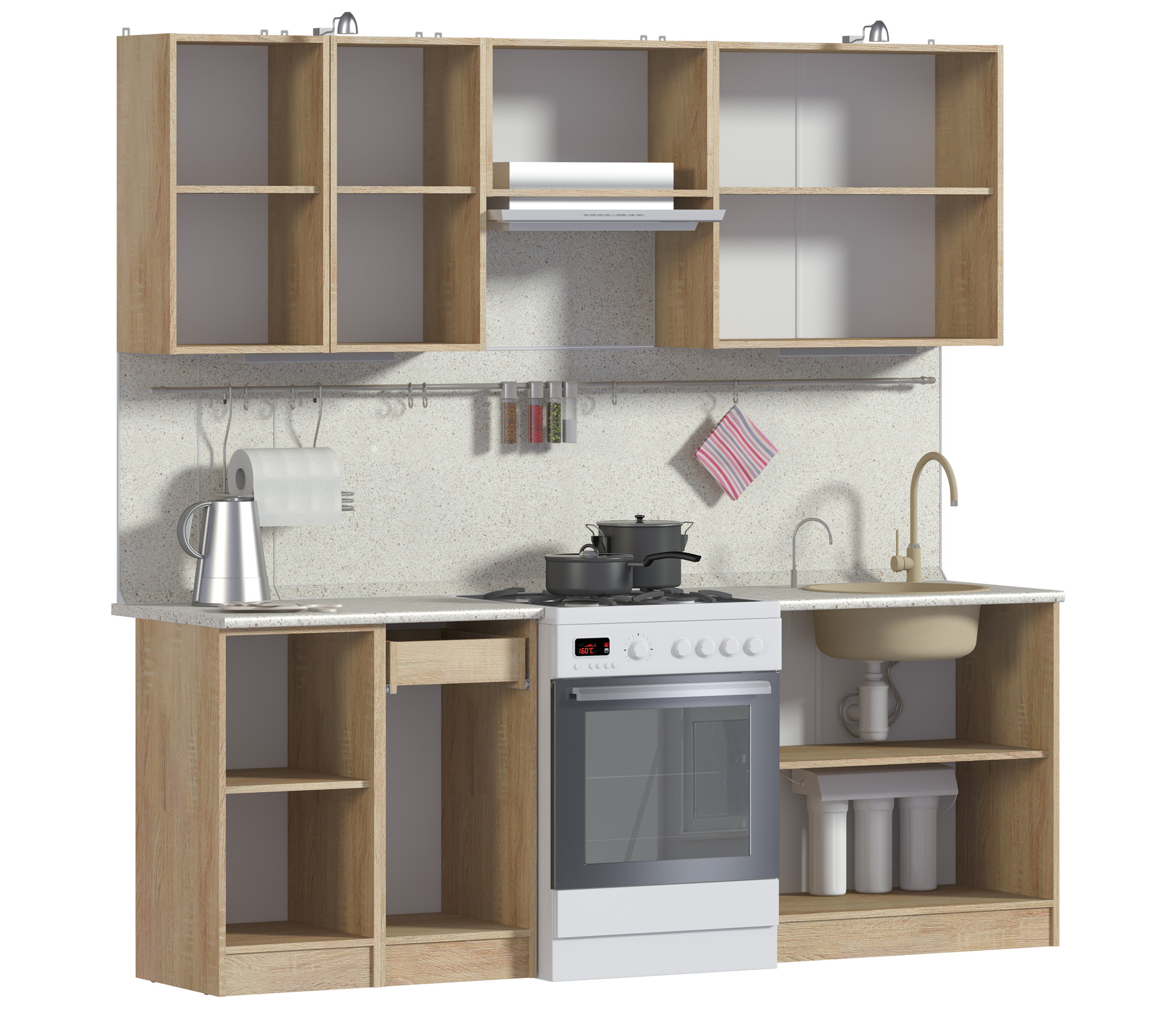 Уютная , удобная кухонька. Цвет нейтральный, подходит под любой интерьер. В таком не большом комплекте есть все необходимое.