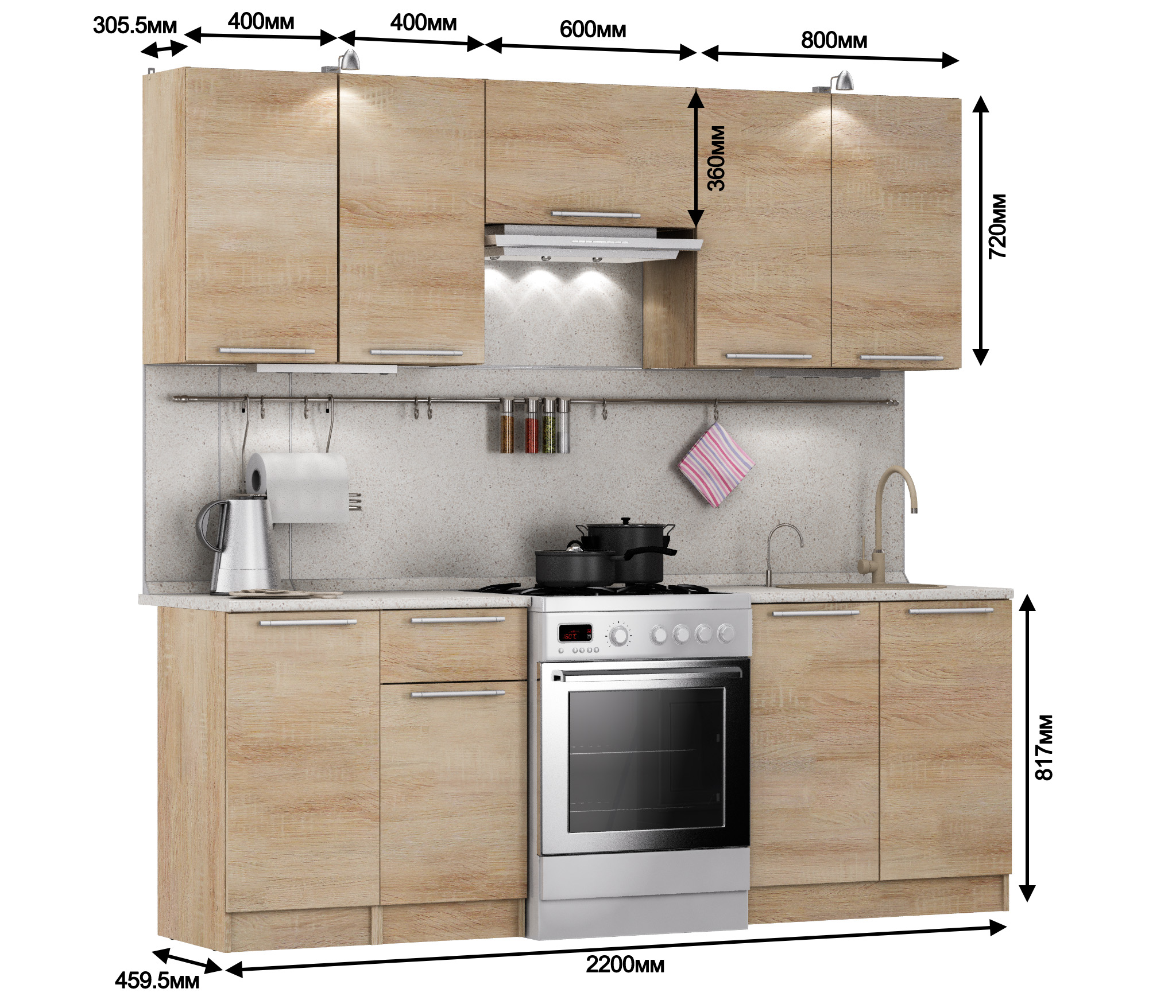 4 полки: полка 40см, полка 40 см, 60см полка над вытяжкой, 80 см с двумя распашными фасадами, полка 40см.