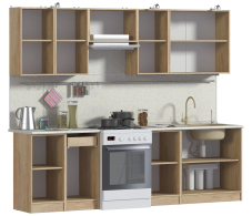5 полок: полка 40см, полка 40 см, 60см полка над вытяжкой, полка 40см, 80 см с двумя распашными фасадами.