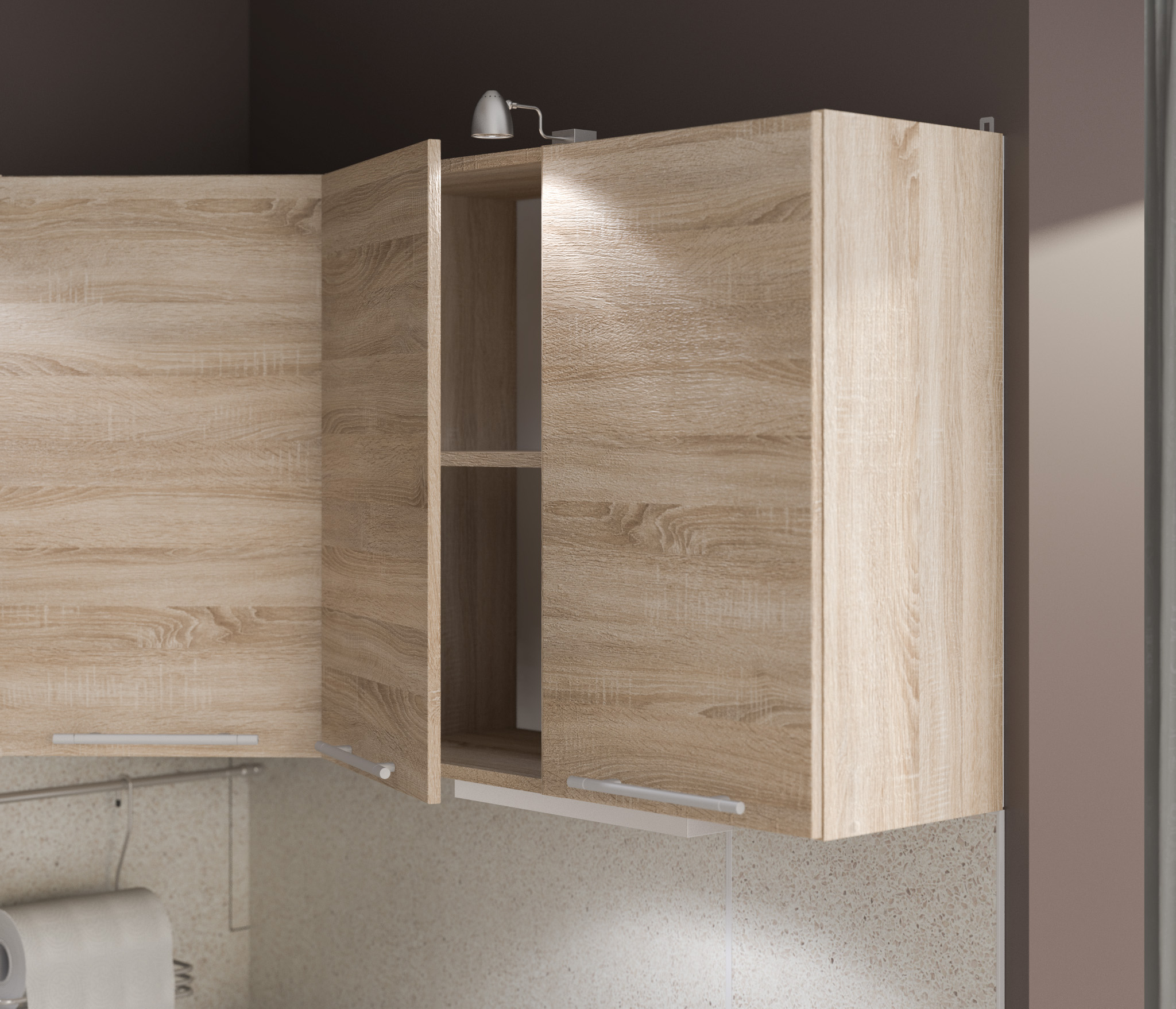 5 полок: полка над вытяжкой 60см, полка 80 см с 2мя фасадами, угловая полка 60 см, полка 40см, полка 40см.
