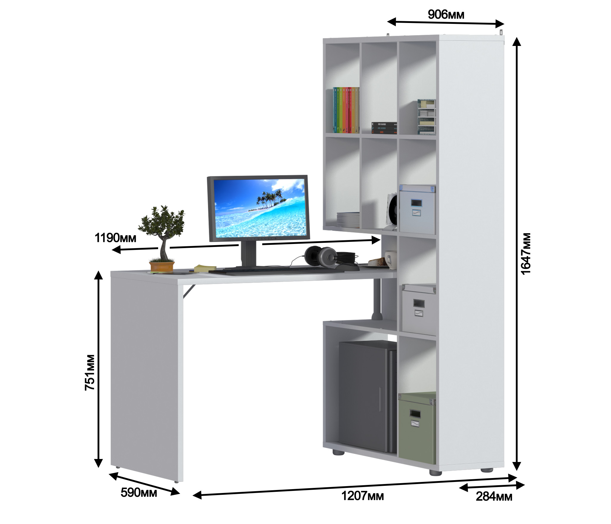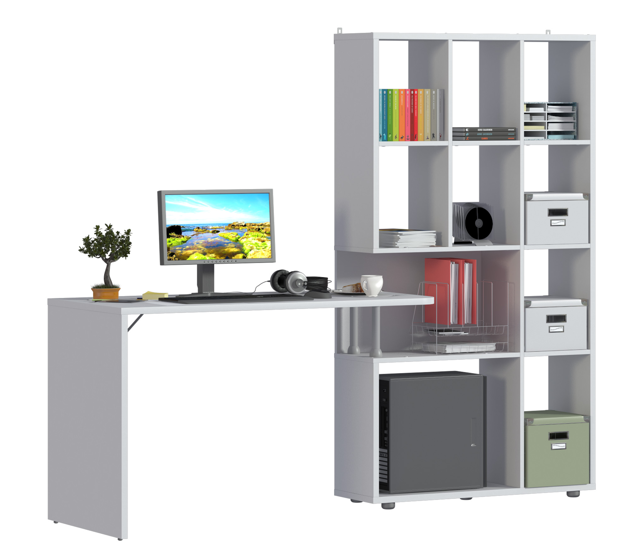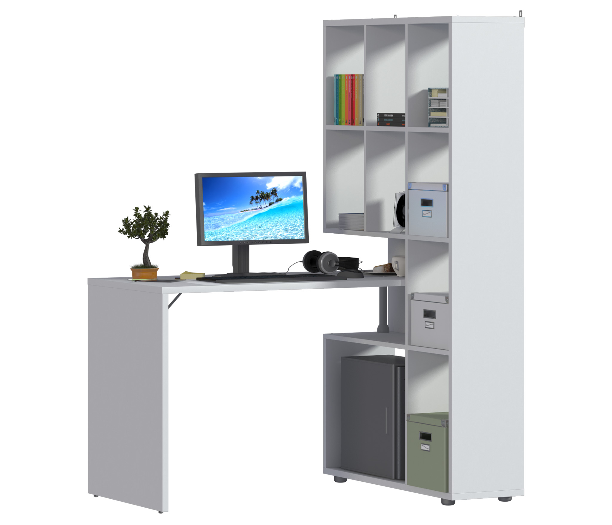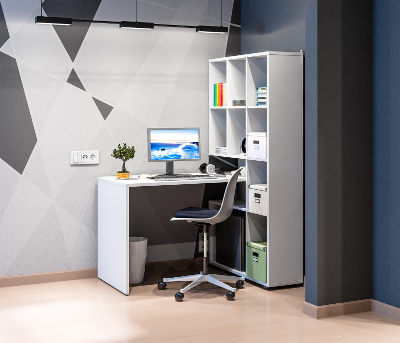 Стеллаж «Техно» в новом белом цвете выбор для тех, кому необходимо организовать эргономичную зону для занятий или работы. Стеллаж можно устанавливать как в прямой компоновке, так и меняя ее, при этом столешница может быть как с правой так и с левой стороны. Длину изделия можно установить от 150 до 199 см, прикрепив столешницу на необходимом расстоянии от стеллажа. Можно сделать угловую компоновку, закрепив столешницу перпендикулярно к стеллажу с левой или правой стороны. Стеллаж оснащен креплением для стены.
