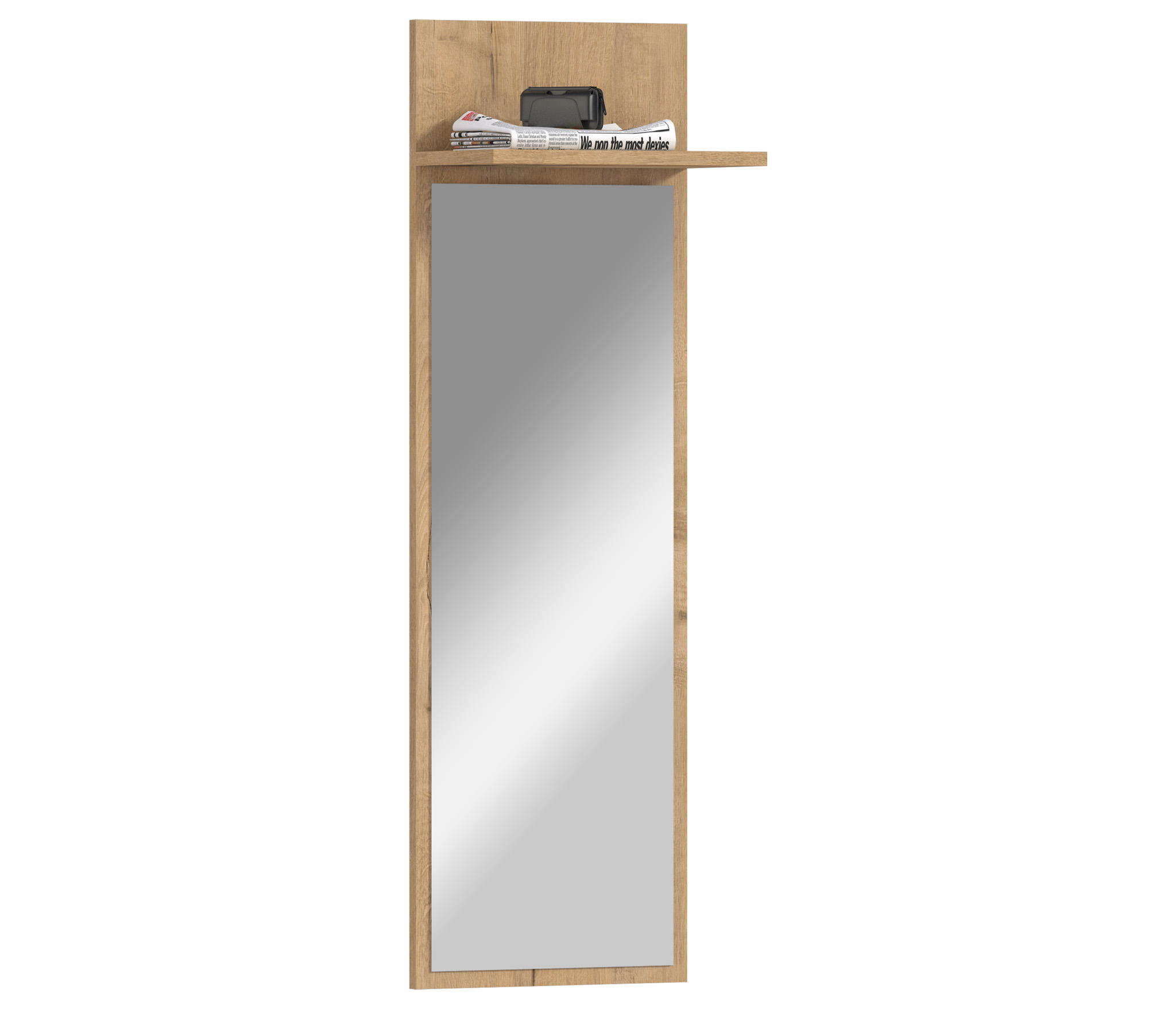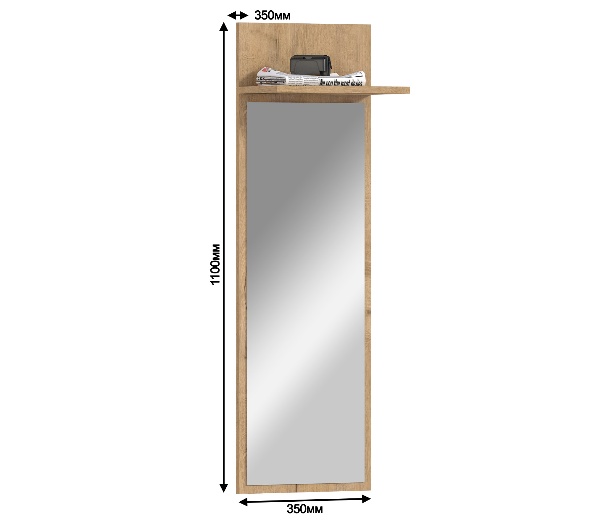 Сидней СБ-2581 – настенное зеркало прямоугольной формы, которое оптимально впишется в интерьер прихожей, коридора, спальни или кабинета. Зеркало выполнено в современном дизайне. Оно будет логичным дополнением к модульной коллекции Сидней. Габаритные размеры – ширина 35 см, высота 110 см и глубина 20 см, позволяют рассмотреть себя в полный рост. Над зеркалом размещена небольшая полка, где можно положить головные уборы или книги. Рама зеркала из прочного современного КДСП.