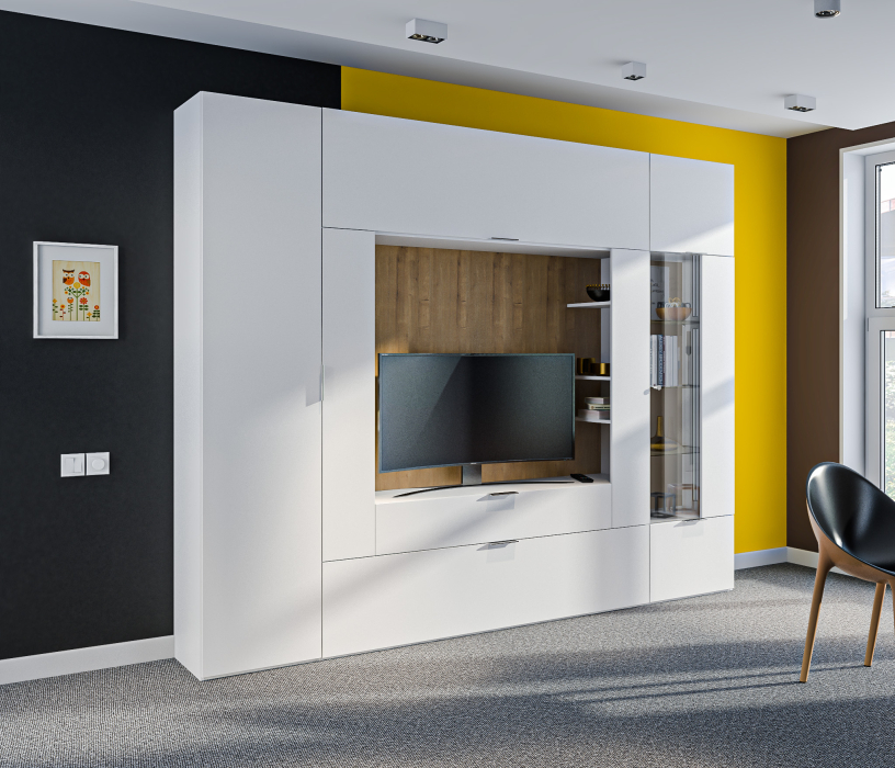 Стенка СБ-3265 имеет удобные и вместительные ящики для вещей и аксессуаров, а также позволит разместить ТВ с диагональю до 55";