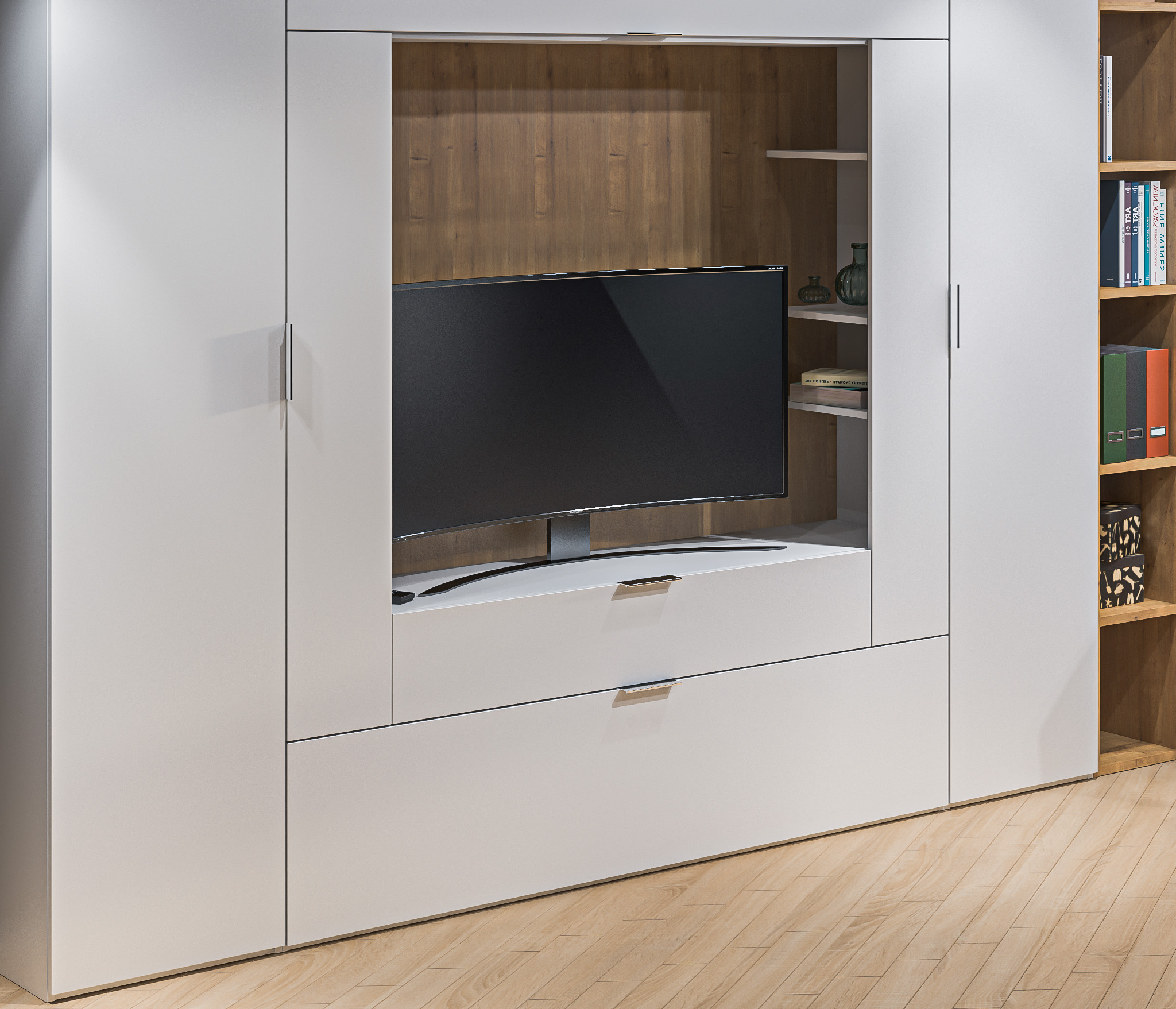Модульная гостиная Мальта создана для ценителей стиля. Белый цвет мебели зрительно расширяет границы комнаты и делает интерьер светлее, а текстура дерева создает атмосферу уюта и близости к природе. Комбинируя элементы нашей новой модульной коллекции, вы сможете создать для себя неповторимый и комфортный интерьер. Высота элементов составляет 2,3 м., что позволит вам получить максимально функциональное пространство.