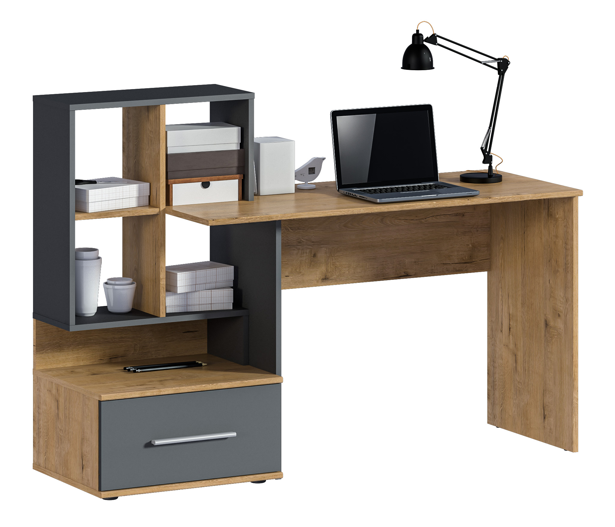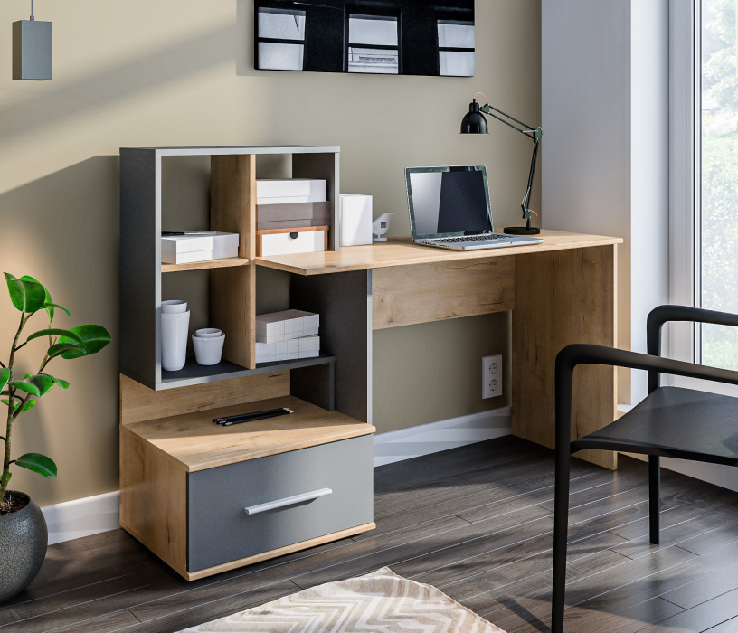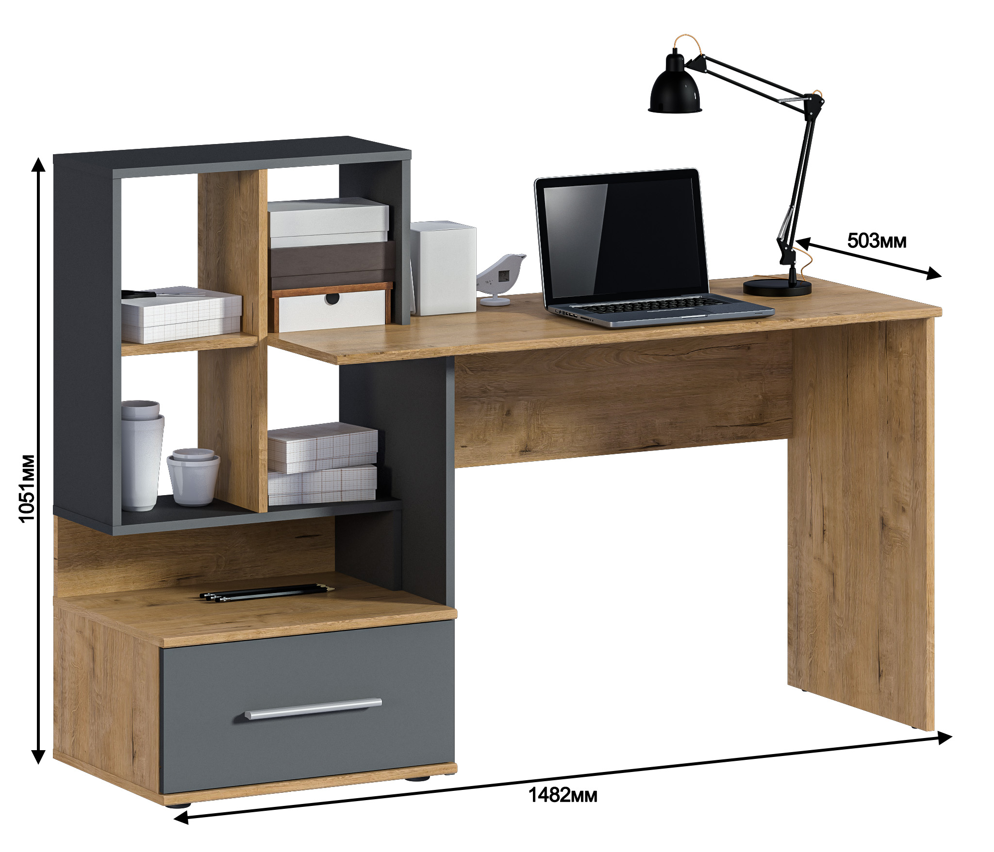 Стол Мамбо СБ-3339 – комфортное рабочее место, где предусмотрены отделения для хранения бумаг, книг, журналов. Он органично впишется в комнату школьника, студента, а также в кабинет. Габаритные размеры стола довольно просторные – ширина 148 см, высота 105 см и глубина 50 см. Рядом с рабочей поверхностью расположено вместительное отделение с полками и с ящиком.