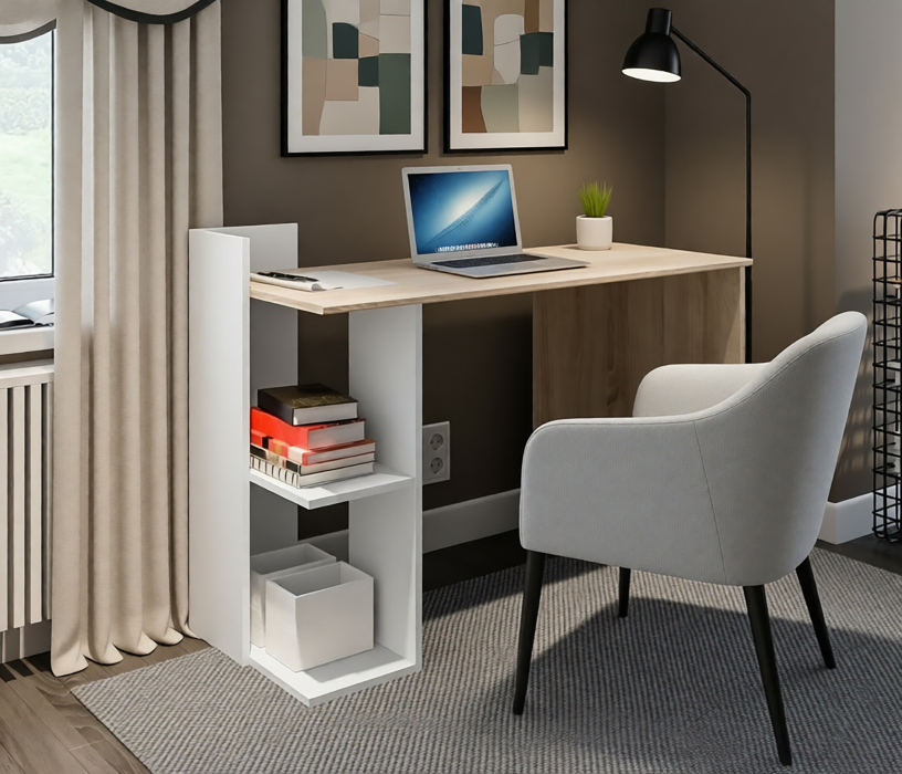Стол Мамбо СБ-3340 – компактное и комфортное рабочее место. Такой стол не займет много места в комнате студента или школьника, а также будет органично смотреться в кабинете или офисе. Габаритные размеры стола Медея – ширина 120 см, высота 85 см и глубина 51 см. Под рабочей поверхностью расположена одна открытая тумба с двумя вместительными полками. Произведен стол из экологичного современного КДСП. Цвет отделки комбинированный: столешница в цвете "Дуб Сонома", а тумба в белом цвете. Лаконичный дизайн, компактные размеры создают ощущение легкости, и стол не выглядит громоздким. Стол Мамбо может быть стилизован в гарнитуре.