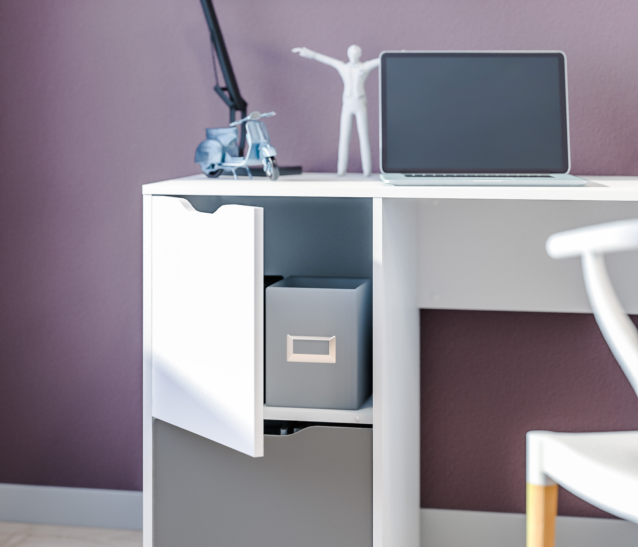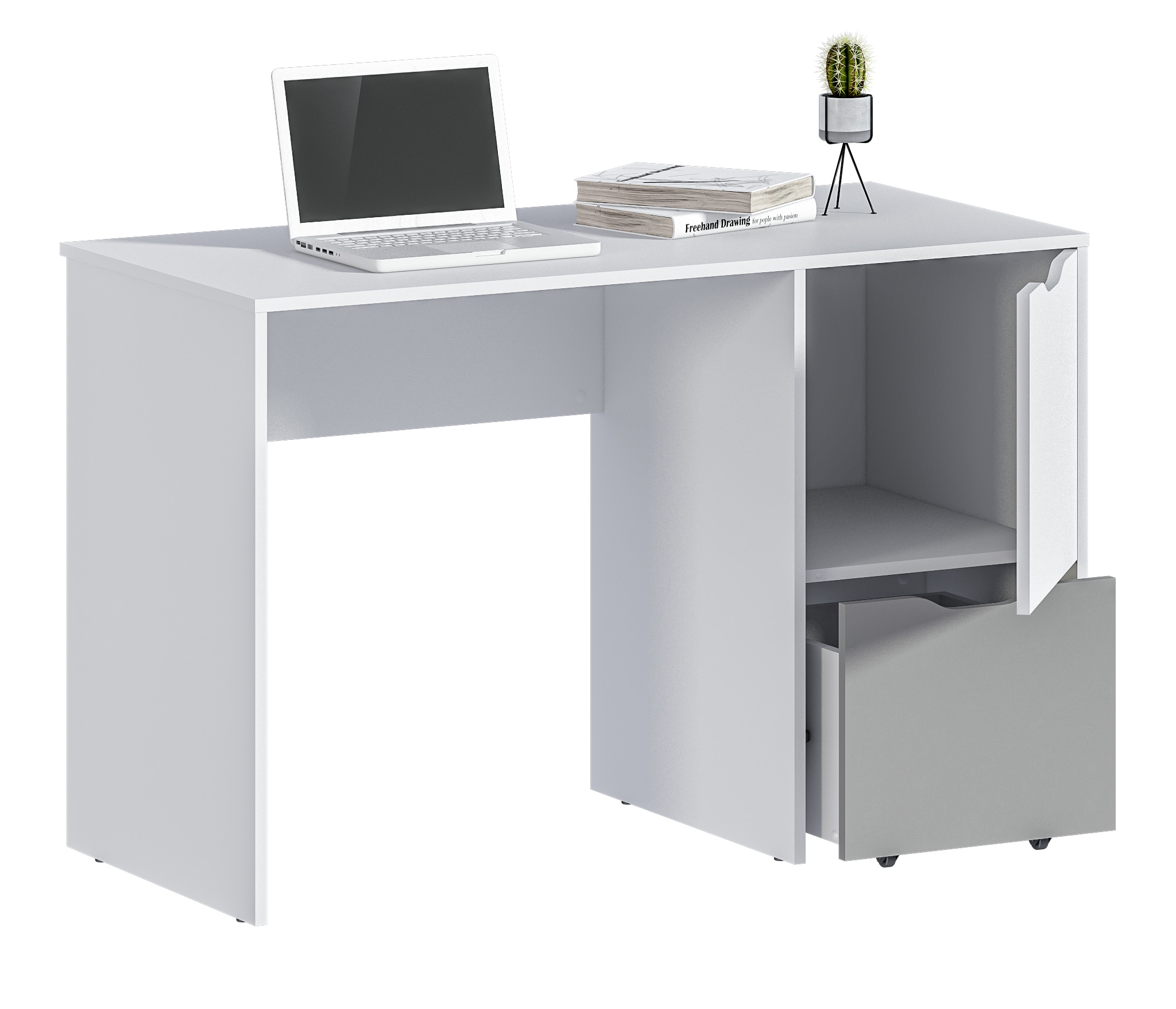 Стол Мика СБ-3276 – компактное рабочее место, выполненное в современном сканди стиле. Стол будет одинаково уместен в офисе, кабинете, детской или в комнате подростка. Стол – элемент модульной коллекции Мика, может быть дополнен предметами мебели из этой коллекции. Габаритные размеры – ширина 119 см, высота 76 см, ширина 55 см. Стол оснащен закрытой полкой, где можно разместить книги, учебники, документы и обширным выдвижным ящиком на колесиках. Ручки фасадов - прорезные. Материал корпуса – ЛДСП с отделкой в цвете «Белый Альпийский». Фасады также из ЛДСП с комбинированной отделкой в цветах «Белый Альпийский» и «Серый перламутровый». Тумба стола может быть установлена как справа, так и слева.