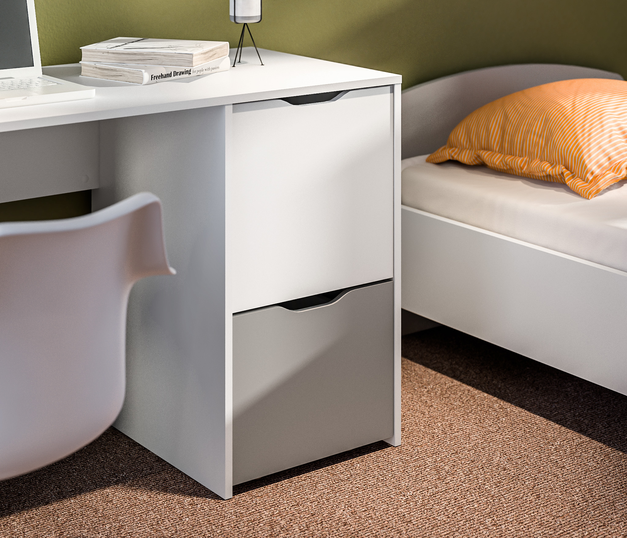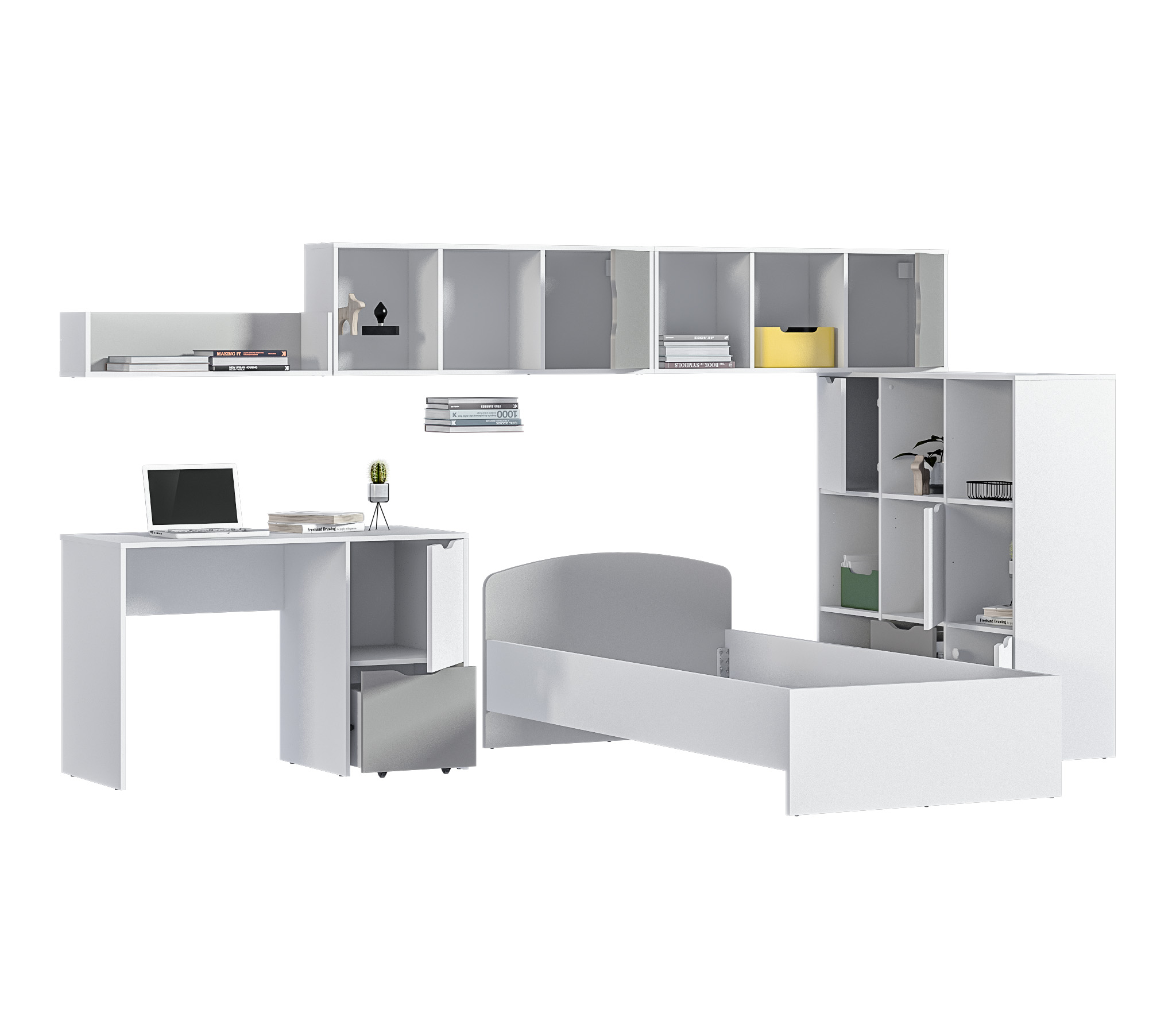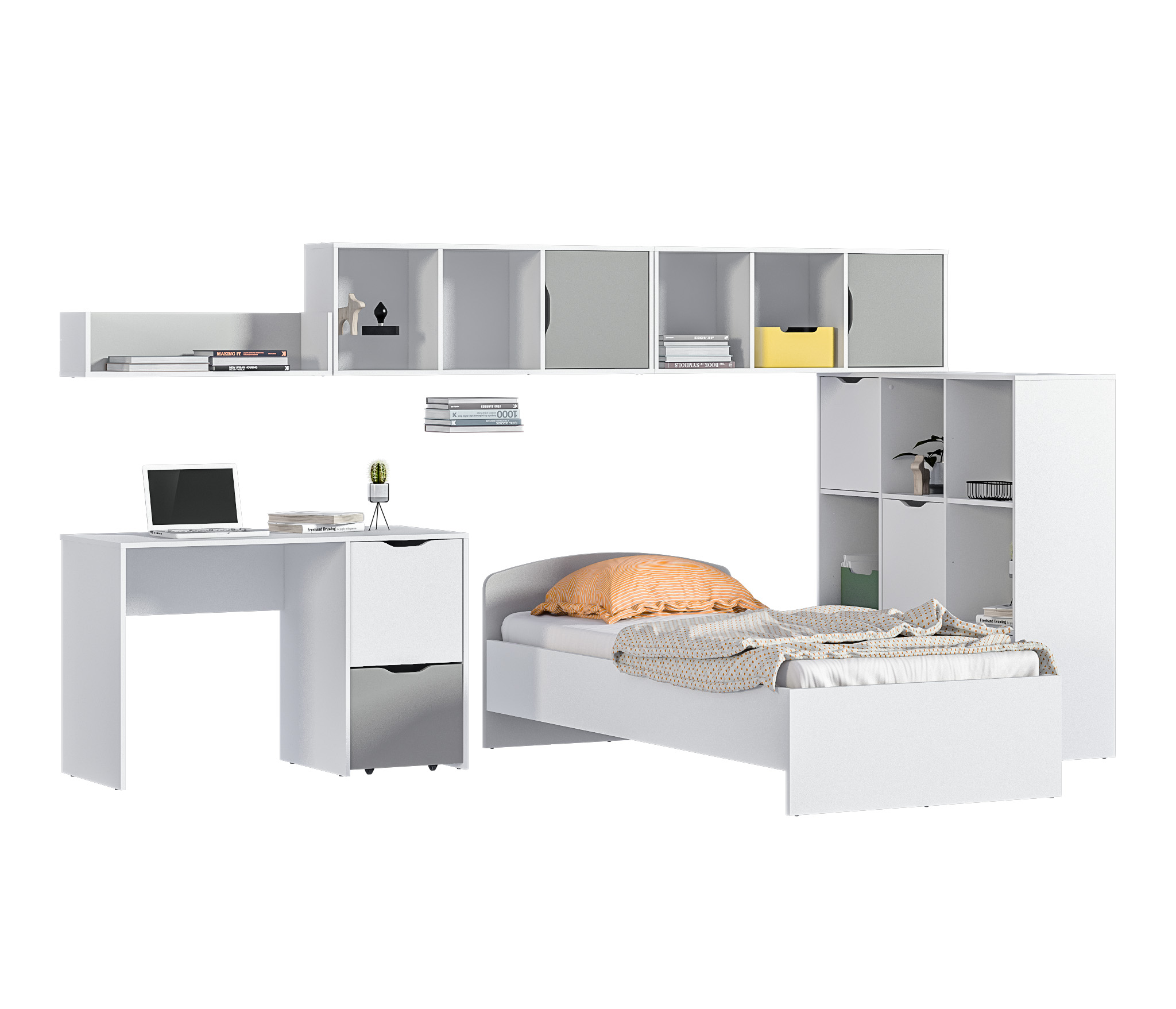 Mika / Мика детская Белый/Серый (кровать 900, стол, стеллаж, полки) Код 00000298346