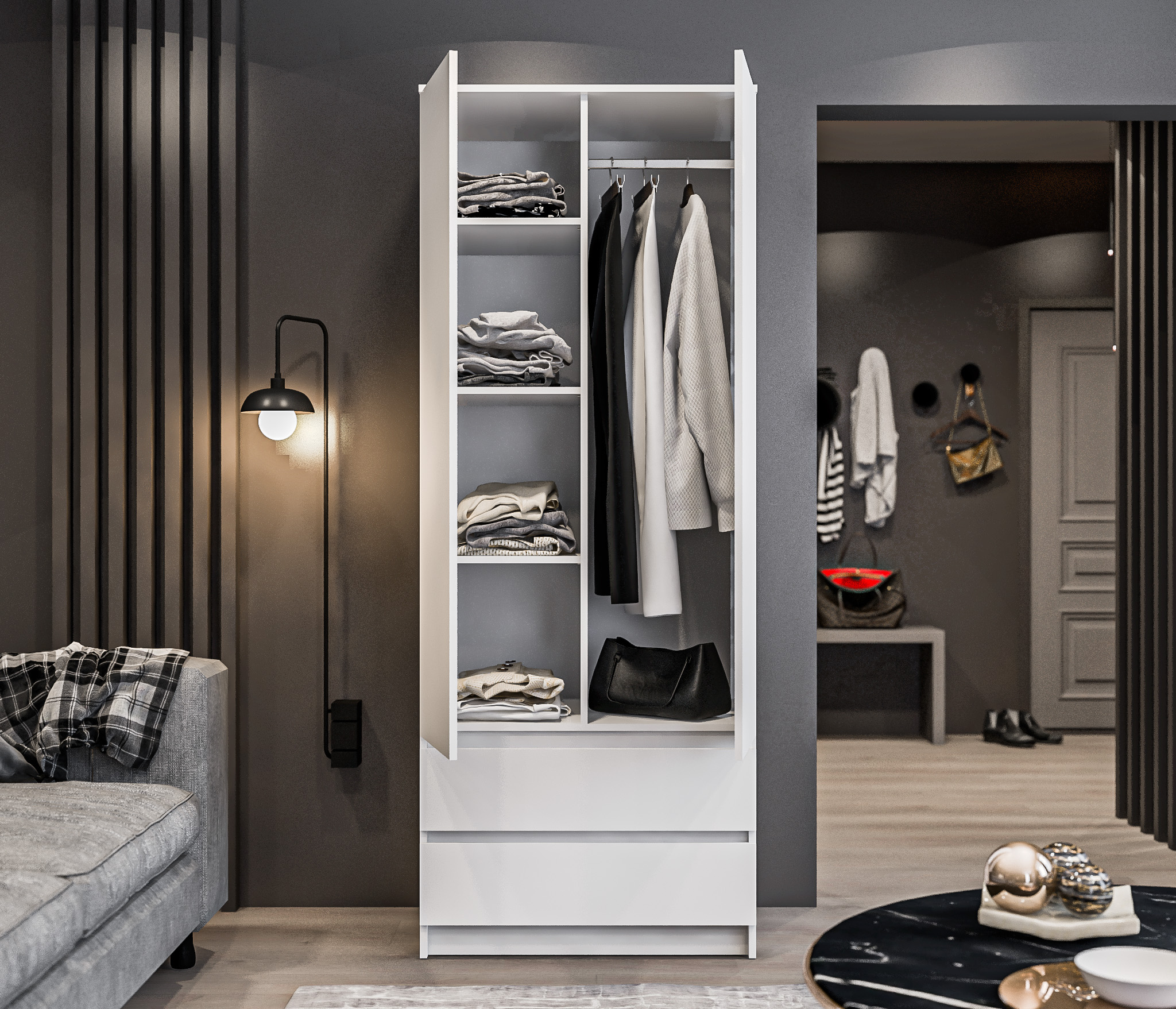 хороший шкаф, очень удобно, что есть и полки и перекладина и выдвижные ящики.