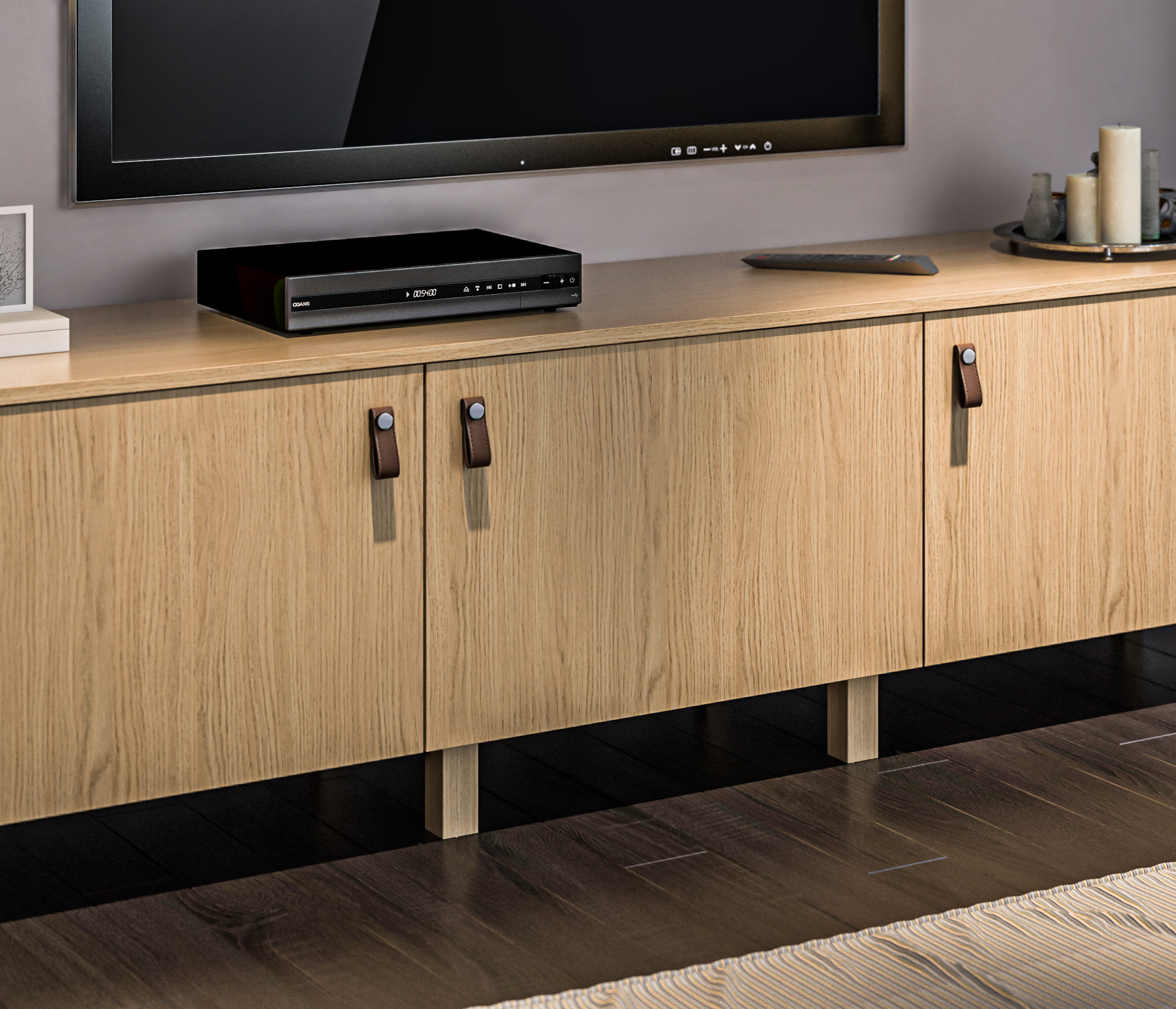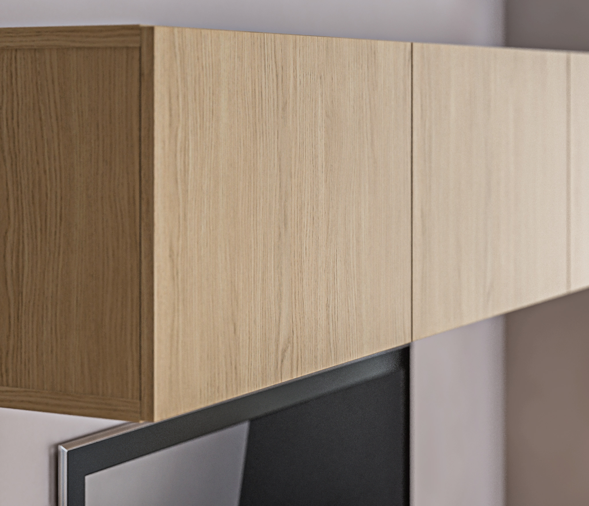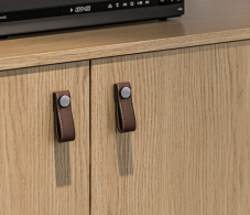 Выбор ручек является дополнительной опцией. В данной гостиной представлена ручка-кнопка в цвете хром/капучино для тумбы под телевизор, верхняя полка оснащена механизмом Push To Open, который позволяет открывать ее легким нажатием.